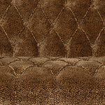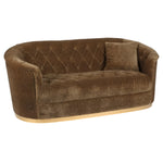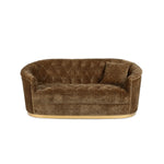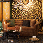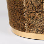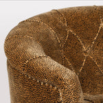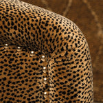 Its curved silhouette and plush padding exude 1920s vintage glamour, accentuated by rich leopard-print upholstery that adds warmth and depth. The tufted seat and backrest highlight impeccable craftsmanship, while a brushed gold base creates a sleek, opulent contrast. Subtle stud detailing along the arms further enhances its artisanal charm, making it both refined and inviting.
