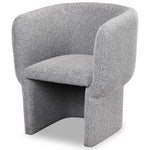 Drawing inspiration from the traditional Greek Lyre, its shape is thoroughly unique with its curved base and all-encompassing backrest. A padded seat ensures comfort and support for an effortless dining experience. From the base to the backrest, its entirety is upholstered in a lovely, Kalpan Grey fabric for a soft, visually appealing finish.
