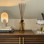 A harmonious blend of earthy sandalwood, creamy vanilla, and bright orange blossom creates a sunlit fragrance that feels both grounding and uplifting. Presented in a minimalist glass bottle with a wooden cap and coordinating reeds, it combines rustic charm with refined simplicity.