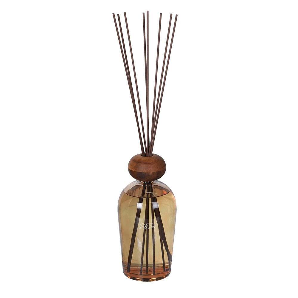 A harmonious blend of earthy sandalwood, creamy vanilla, and bright orange blossom creates a sunlit fragrance that feels both grounding and uplifting. Presented in a minimalist glass bottle with a wooden cap and coordinating reeds, it combines rustic charm with refined simplicity.