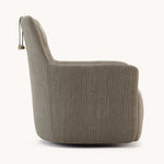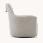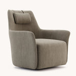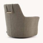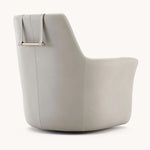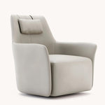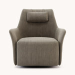 With a high back and arching armrests, it is broad and inviting, encouraging relaxation from the very first moment. Its hidden, inset base features a 180-degree swivel mechanism, allowing for maximum versatility and freedom of movement. Held in place by a metal counterweight, it includes a matching cushion which can be used as a head rest or for lumbar support to suit your needs and preference.