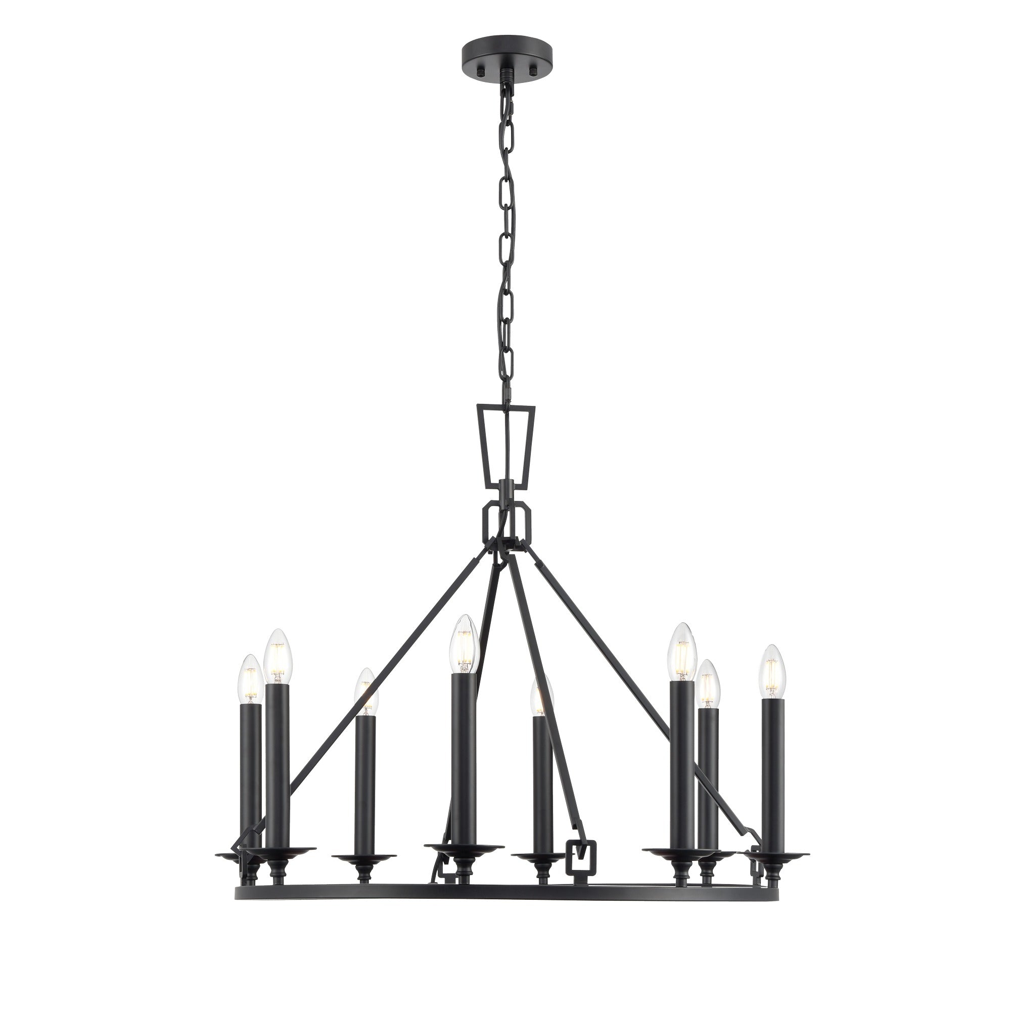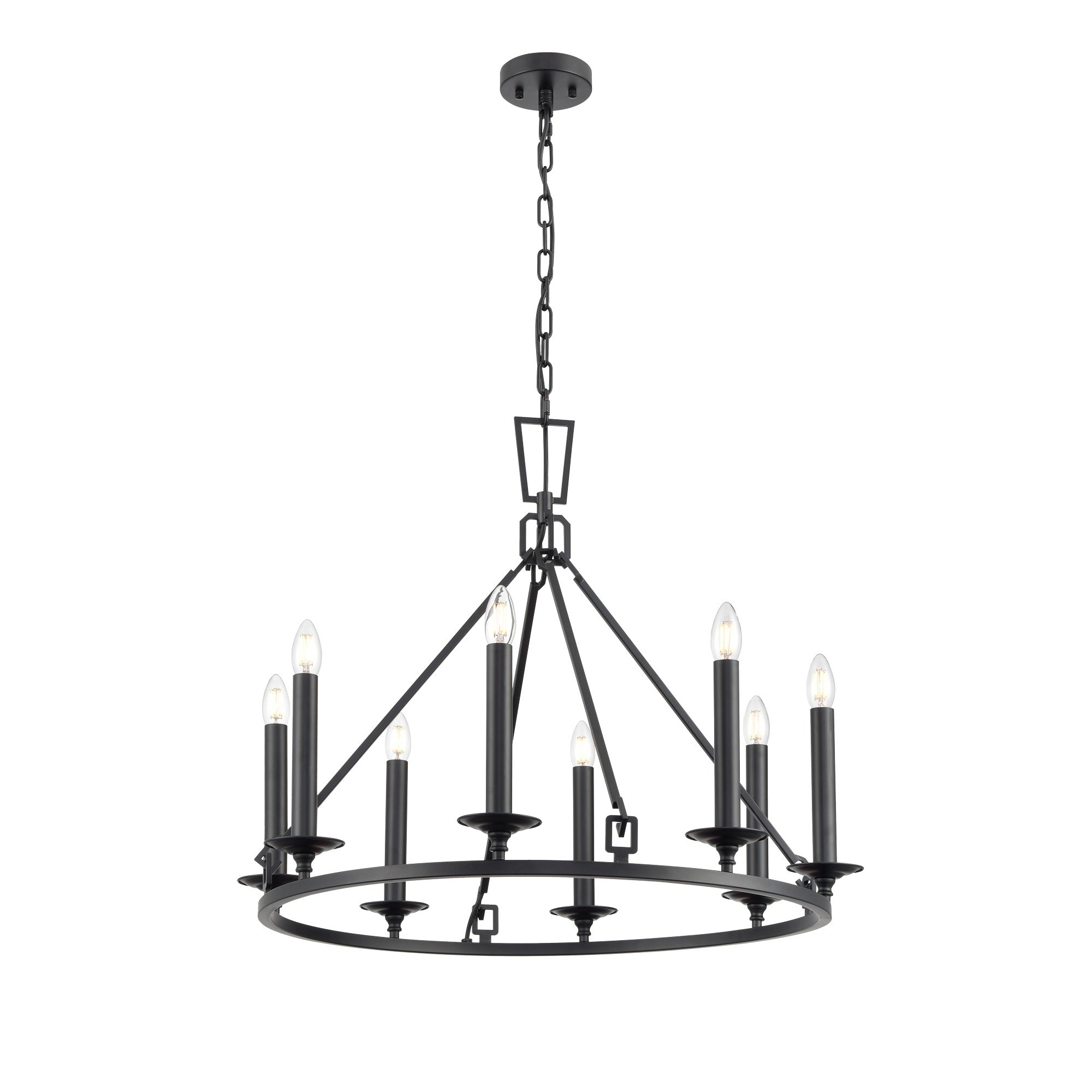 Its bold, ring-shaped frame offers a striking yet minimalistic silhouette, finished in matte black for an understated industrial touch. Eight candelabra-style holders are thoughtfully arranged to echo the look of classic candlelight, blending historical charm with modern simplicity. The open design creates a sense of space and balance, making it ideal for dining rooms, entryways, or vaulted ceilings.