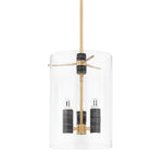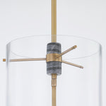 Its cylindrical glass shade showcases a sculptural interior, pairing vintage brass metalwork with black marble-effect holders for a striking contrast in tone and texture. With exposed bulbs and a clean-lined silhouette, it nods to mid-century style while maintaining a contemporary, architectural presence.