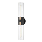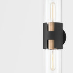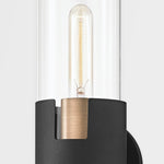Featuring a cylindrical clear glass shade that showcases the bulb, it radiates a soft, diffused glow. that you are sure to love The sleek black fixture is paired with subtle patina brass accents, creating a perfect balance of industrial and modern design.