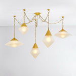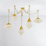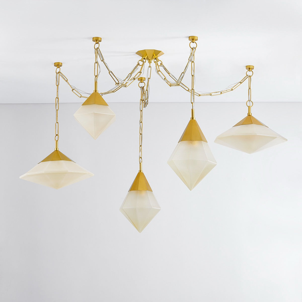 Radiating geometric elegance from every angle, it offers a striking blend of contemporary and Art Deco influences. Faceted, diamond-shaped shades pair beautifully with sharp brass detailing and chunky linked chains, creating a dynamic sense of movement and glamour. Its layered structure adds stunning depth and architectural interest to any space.