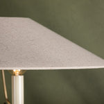 Its broad, linen-textured shade gently diffuses light, creating a warm, inviting glow that enhances any room. The patina brass-finished frame offers a striking contrast to the soft shade, while the exposed bulb fixtures add a subtle industrial edge.
