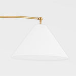 Crafted with sleek aged brass arms and delicate spherical accents, it achieves a balanced aesthetic that combines elegance with an artful flair. Three conical white linen shades provide a crisp contrast, casting a soft, warm light that enhances the atmosphere of your space.