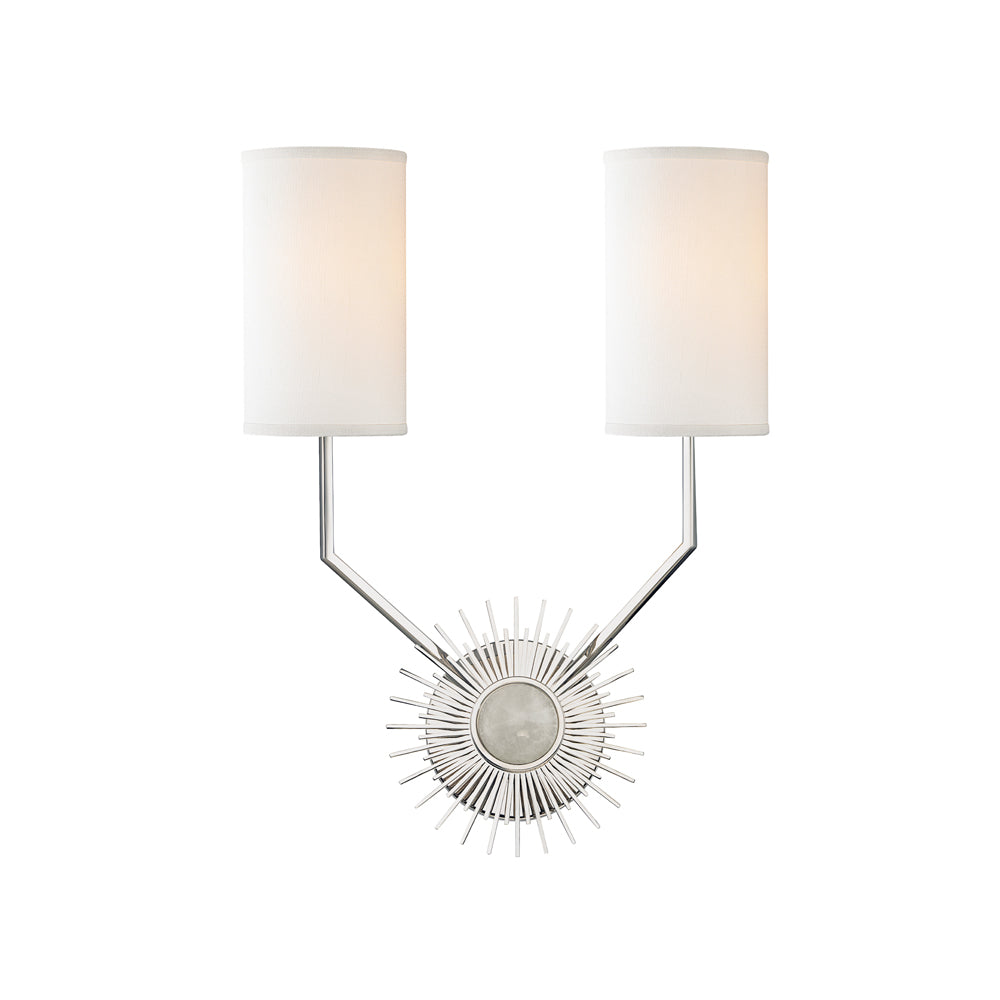 Bring an art installation into the centre of your home with this gorgeous light. The Hudson Valley Lighting Borland Wall Sconce is bursting with radiant polished steel with a central sunburst. This cleverly hides the base plate and the dual lights extend from this. The tubular shades are decorated with eggshell white silk for easy matching with any interior décor. Perfect for minimalist and modern spaces to lighten and increase the size of any room. This is the ultimate choice for pure elegance where you need it most. Improve your bedroom with one of these sconces or add to or three to your conservatory or dining area.
