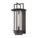 Secured between circular metal plates at the top and bottom, a clear, cylindrical shade houses a singular bulb to illuminate your space. Four sleek, angular rods extend from the base of the wall sconce, crossing over at the top for a stylish effect. Accentuating its traditional appeal is its lovely, bronze colour which adds a touch of understated class.