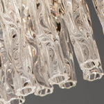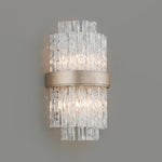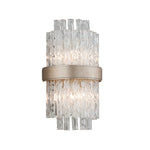Surrounding a pair of light bulbs are two layers of clear glass rods which impress with their intricate, ripple detailing. Finished in polished silver leaf, a sleek metal band wraps around its centre, providing a luxurious highlight.