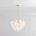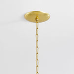 Suspended from a sleek chain, its aged brass metalwork introduces a warm, luxurious tone to any space. The intricately crafted blonchino glass shades feature irregular, molten-like textures that catch and reflect light beautifully, creating a soft, almost ethereal glow.