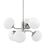 The polished steel of the Hudson Valley Lighting Estee Chandelier offers a lovely first impression. There are six spherical opal globes extending from this, each giving pleasant and appreciable light. Their jaunty angles add to its interesting look and style. The black ceiling flower adds that sense of the dramatic for a touch of elegance with design. Place this somewhere it can make a strong impression such as the dining room or for open plan living. Its heightened sense of flawless design is superb. The diffused light ensures it will offer the best possible light to your space and an impressive element to your home.