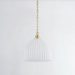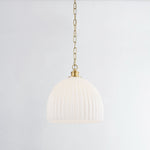 Suspended from an aged brass chain, this pendant exudes refined vintage charm while maintaining a contemporary edge. Its fluted glossy opal glass shade, with a softly rounded silhouette, radiates warmth and sophistication. The rich brass contrasts beautifully with the opal glass, creating a balanced design that enhances both classic and modern interiors.