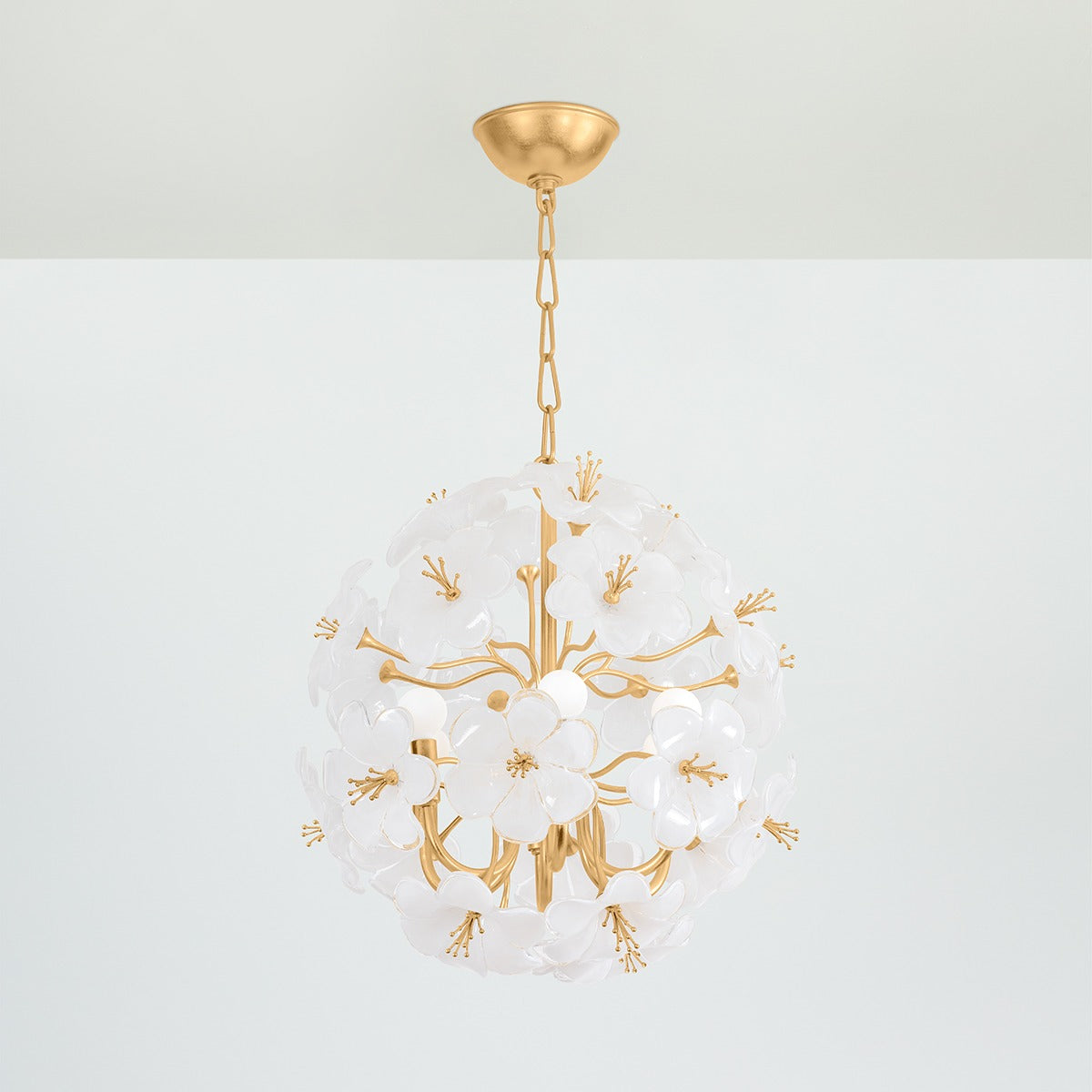 Channelling the elegance of nature, this striking design transforms organic inspiration into a highly sculptural form. A sphere of delicate piastre glass flowers, supported by flowing golden stems, creates an air of natural grace with a modern edge. Impactful yet subtle, it bathes your space in a soft, welcoming glow.