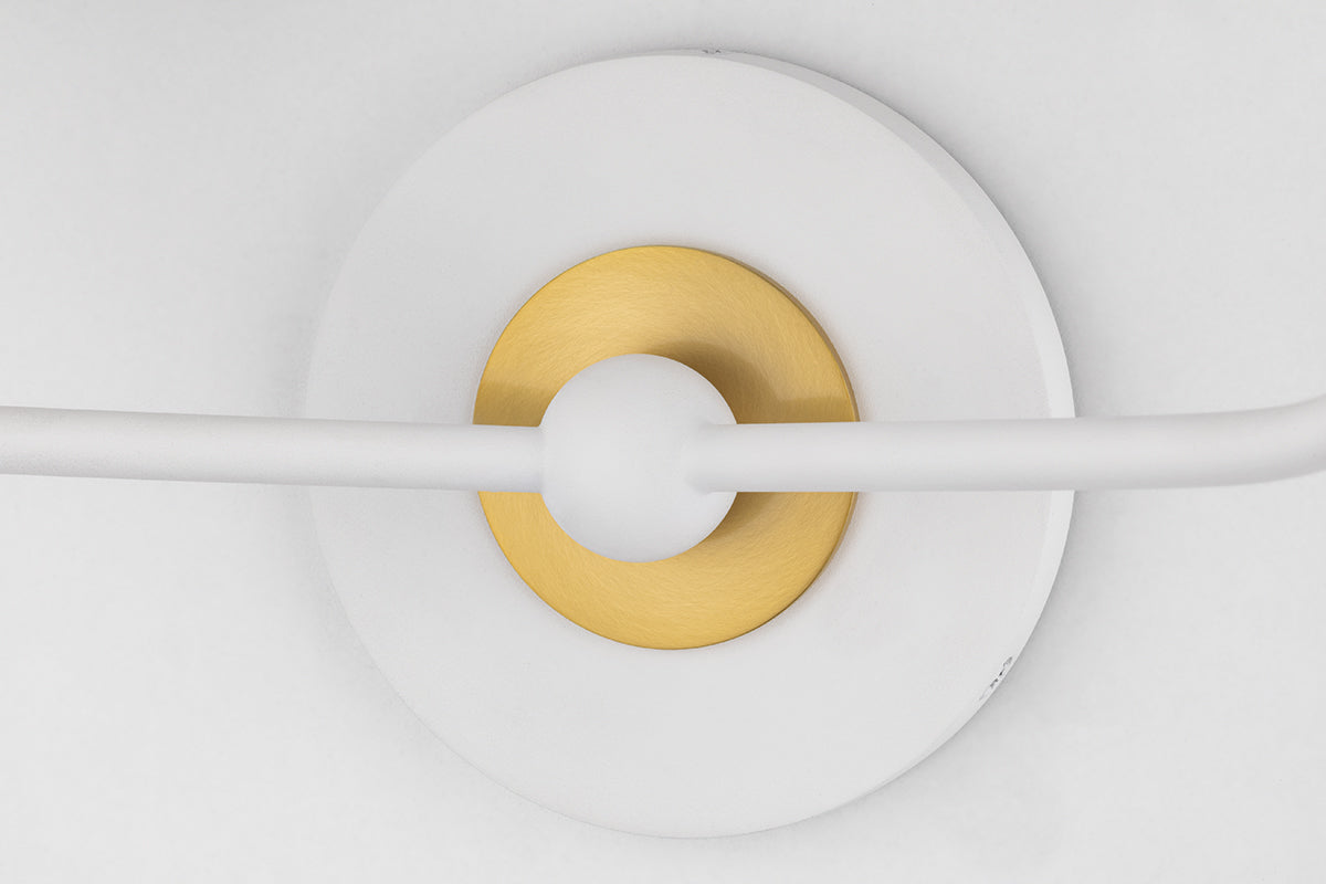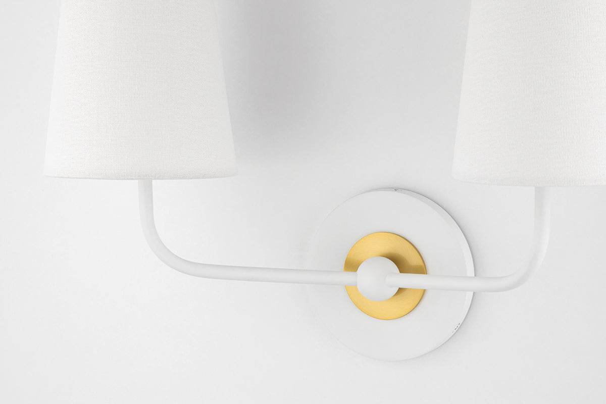 Featuring a crisp white circular backplate adorned with tasteful aged brass metal accents, the sconce exudes a sense of refined sophistication. Two gracefully curved stems extend upwards, culminating in off-white conical shades that casts a soft, inviting glow.