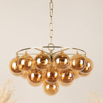 Its delicate, cloud-like silhouette showcases an array of plated champagne glass globes, each reflecting a warm, golden glow. Suspended from an elegant aged brass frame, the luxurious globes strike a perfect balance between sophistication and whimsy.