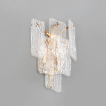 The beauty of this wall sconce begins with its branch-like metalwork, which is finished in a lovely, royal gold. Gracefully adorning the fitting are several exquisite sheets of textured glass which allow the subtle gleam of the metal to shine through. Three bulbs emit a gentle glow, filling your room with radiant warmth.