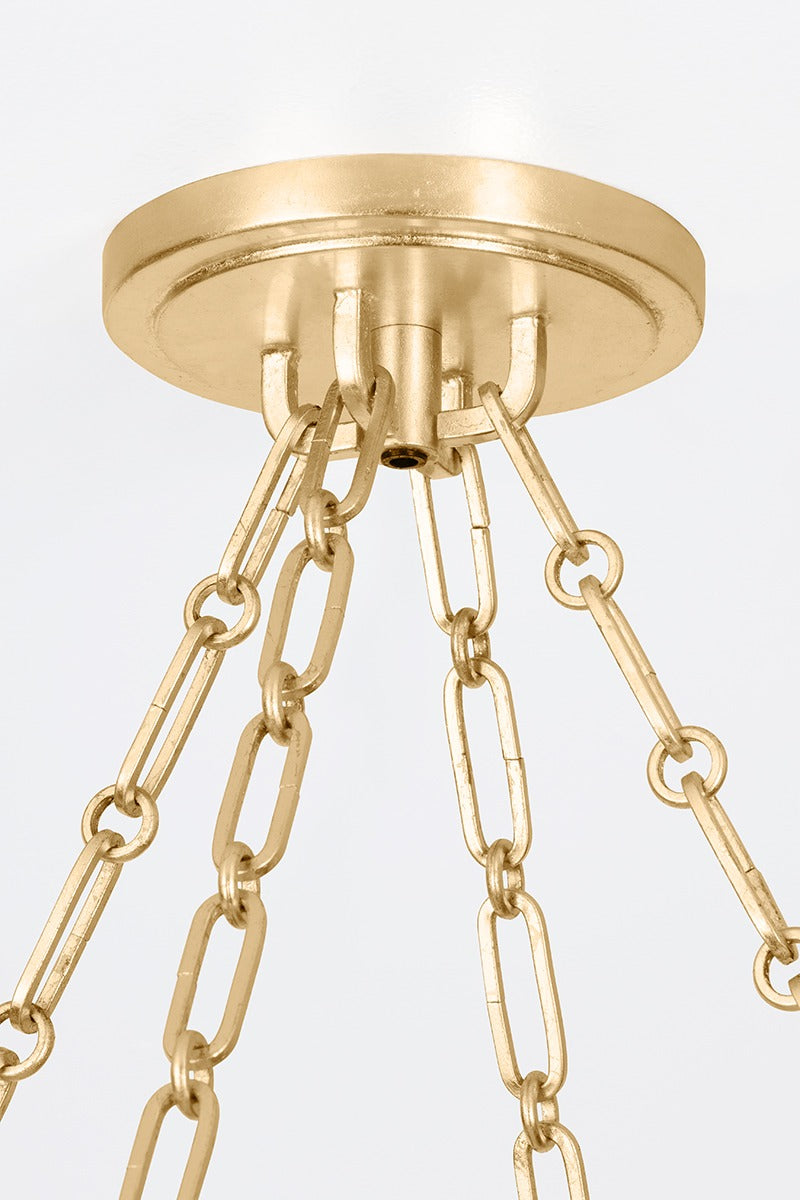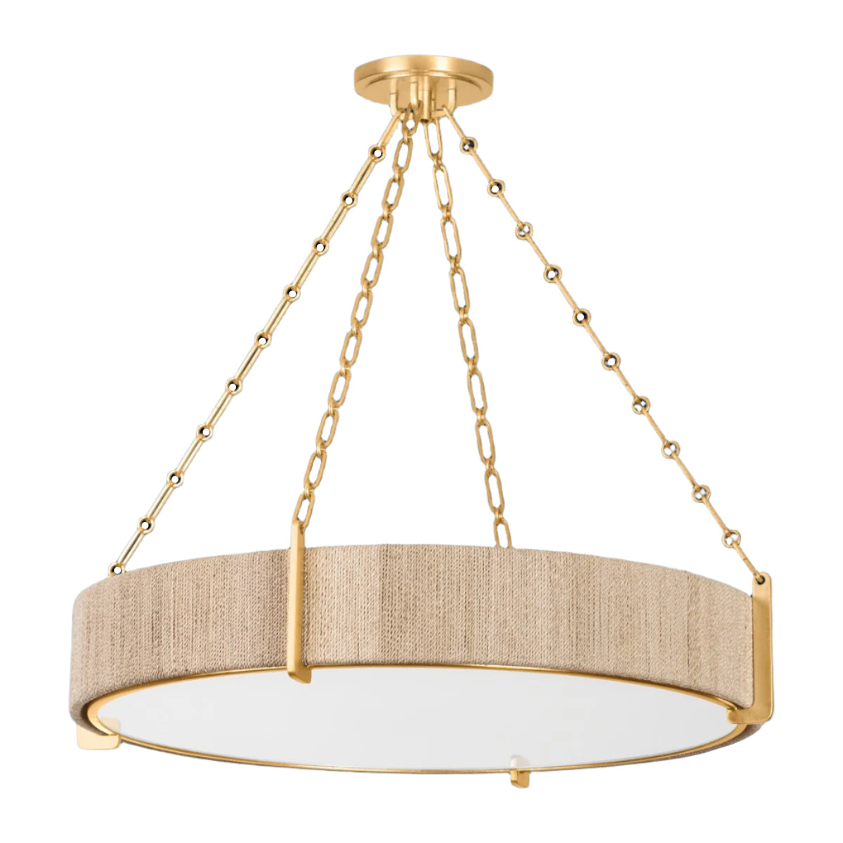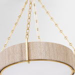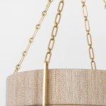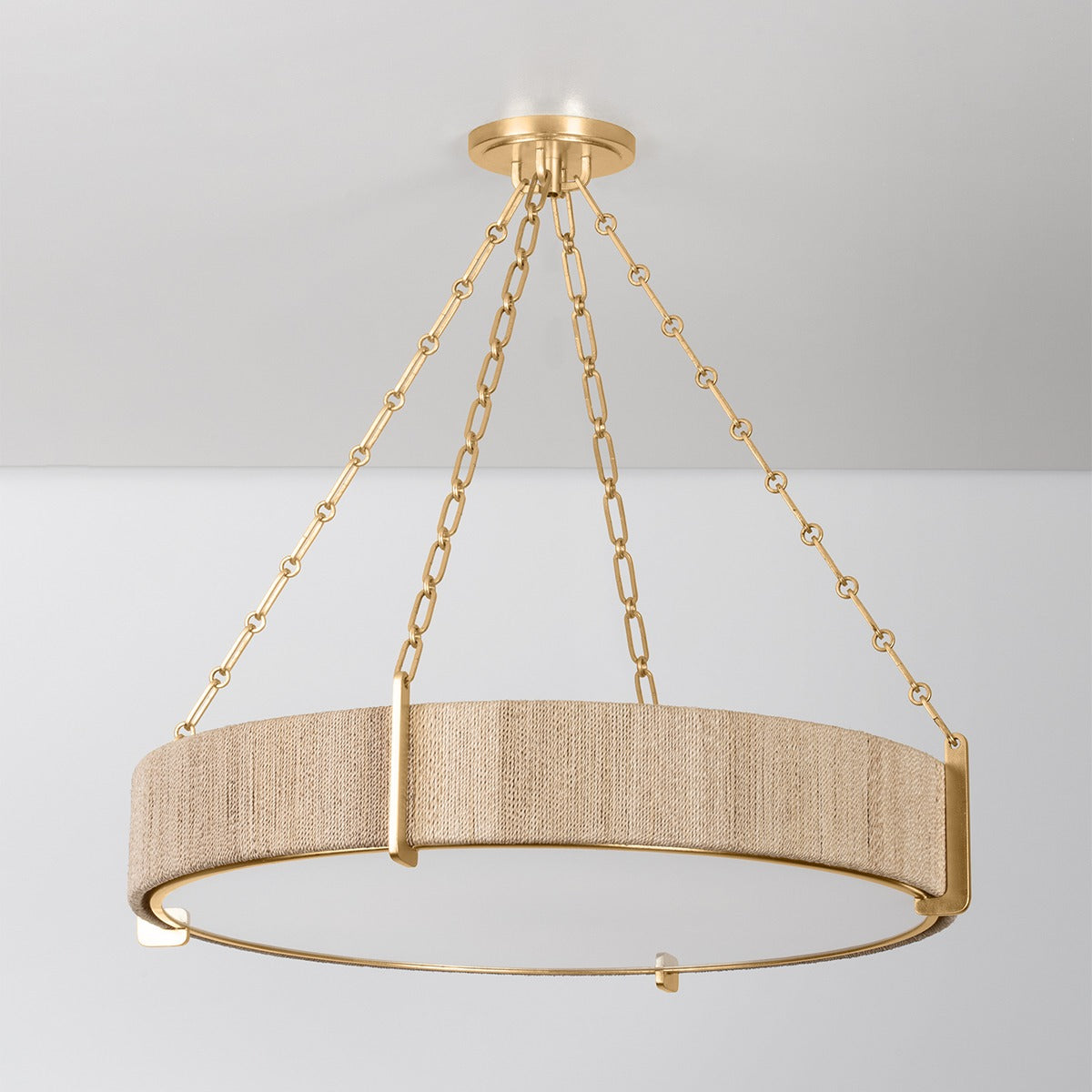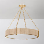 Suspended from a graceful, gold leaf-finished chain, its drum-shaped shade is wrapped in natural abaca, offering a rustic, tactile appeal. The organic weave beautifully contrasts with the metallic sheen, filling your space with a warm, ambient glow.