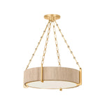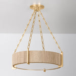 Suspended from a graceful, gold leaf-finished chain, its drum-shaped shade is wrapped in natural abaca, offering a rustic, tactile appeal. The organic weave beautifully contrasts with the metallic sheen, filling your space with a warm, ambient glow.