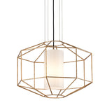 Hanging from a black cord, its singular light is paired with a cylindrical, opal glass shade to fill your room with vibrance and warmth. It is surrounded by a sleek, geometric frame, intricately crafted from metal, and finished in gold leaf for the perfect mix of abstract and contemporary.