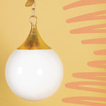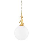 Featuring a smooth white glass orb framed by elegant vintage gold leaf metalwork, this pendant captures the essence of classic sophistication with a whimsical twist. Sculptural detailing adds a touch of artistry, while the warm metallic finish infuses your space with a sense of luxury.