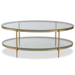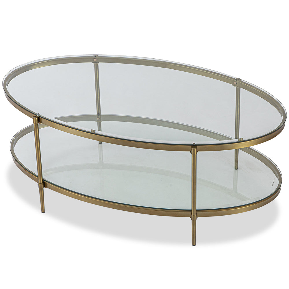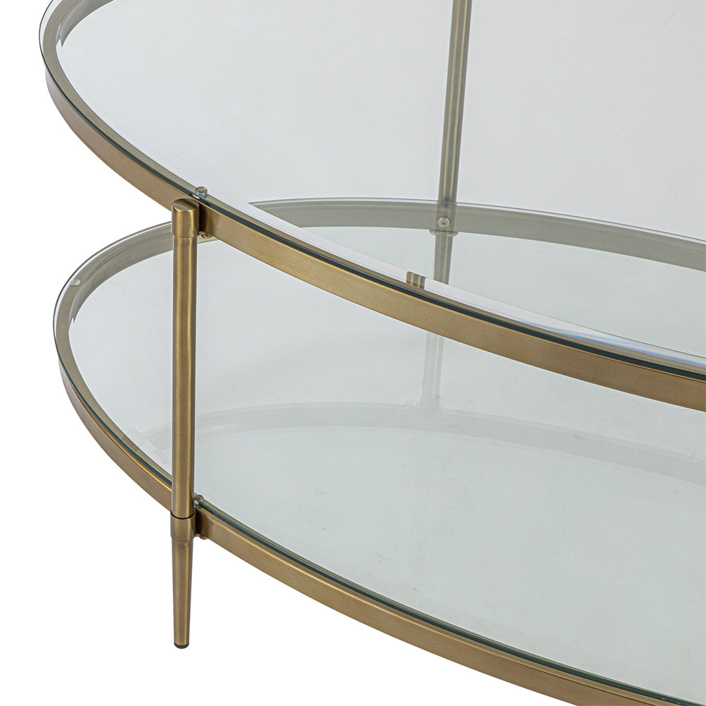 Its durable stainless-steel frame gleams with its brushed brass finish, radiating beauty throughout your room. It features two oval layers of glass – a smooth tabletop and underlying shelf which is perfect for storing books or displaying decorative pieces.