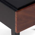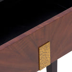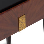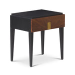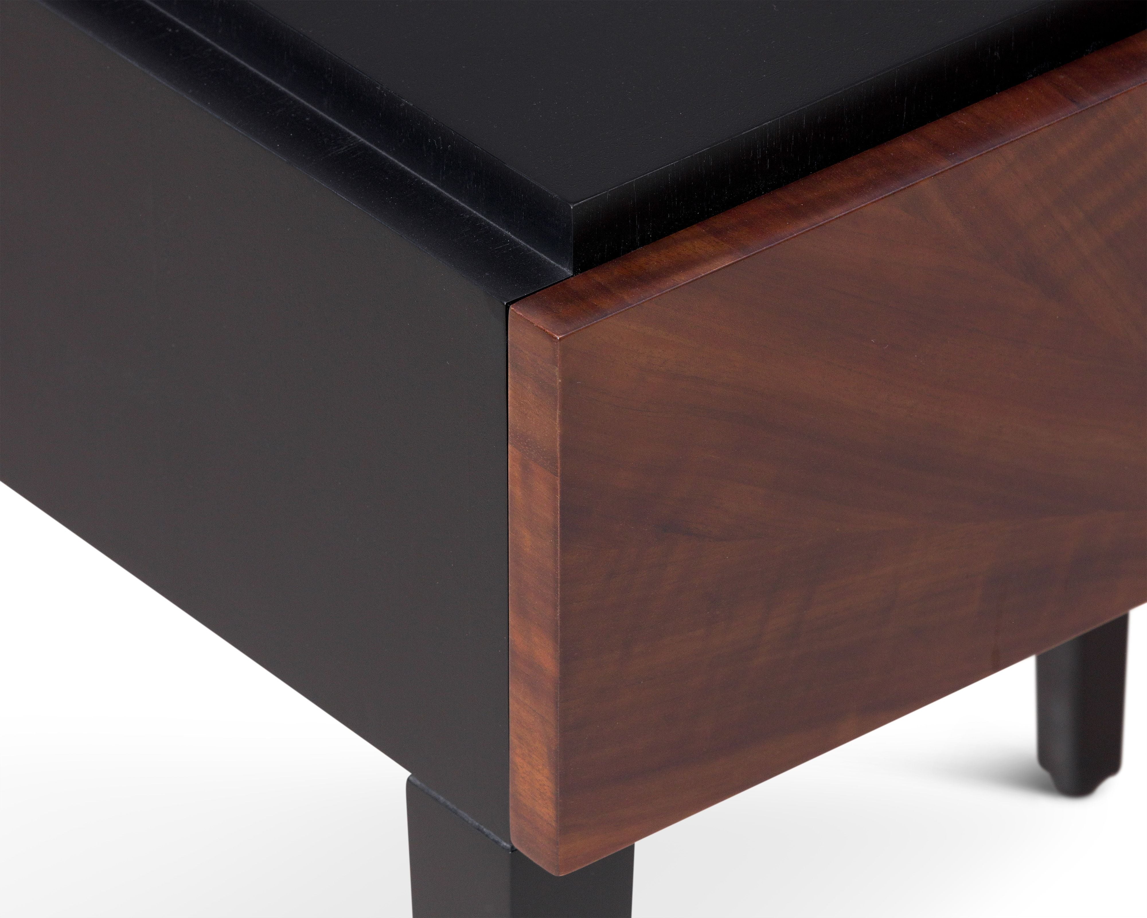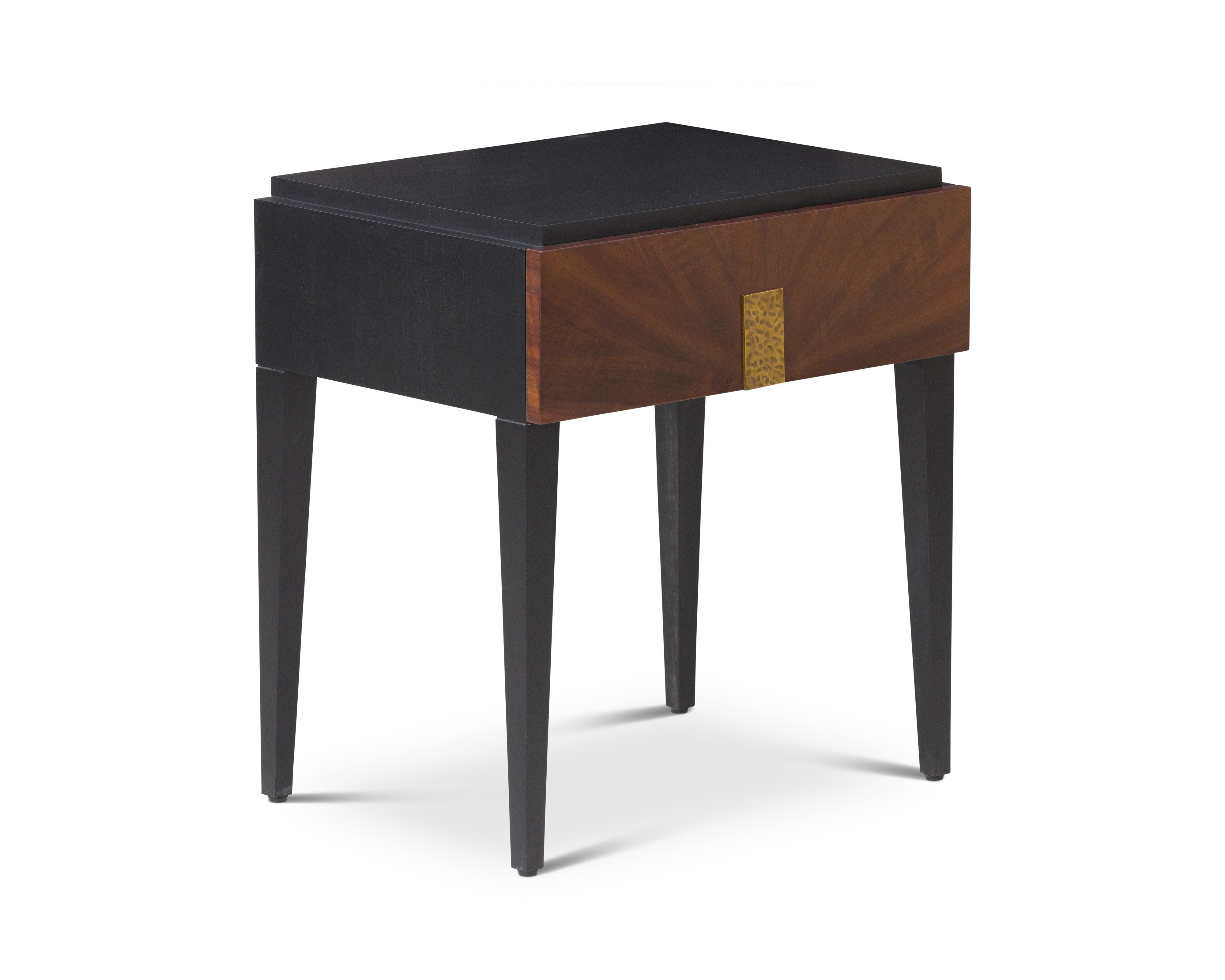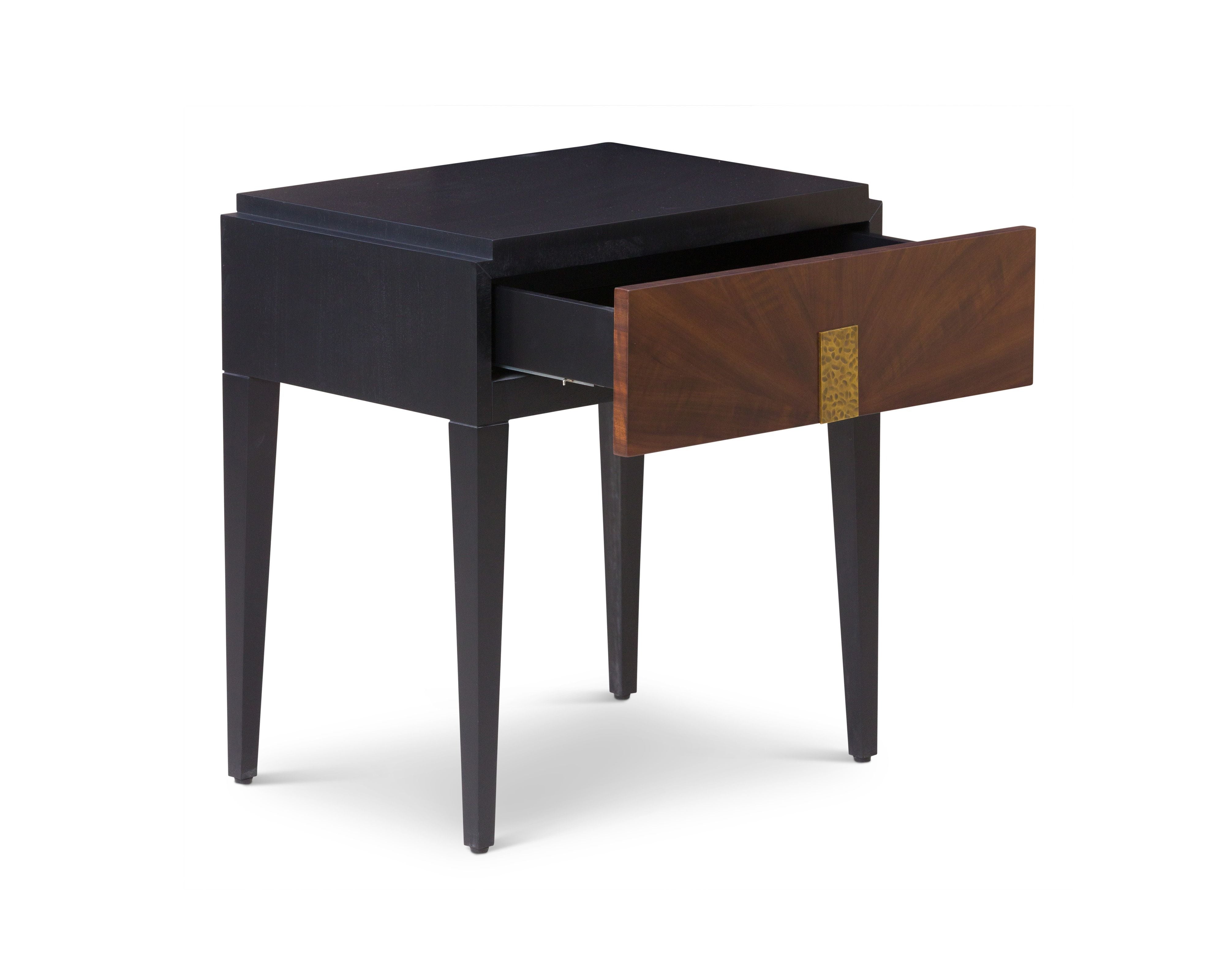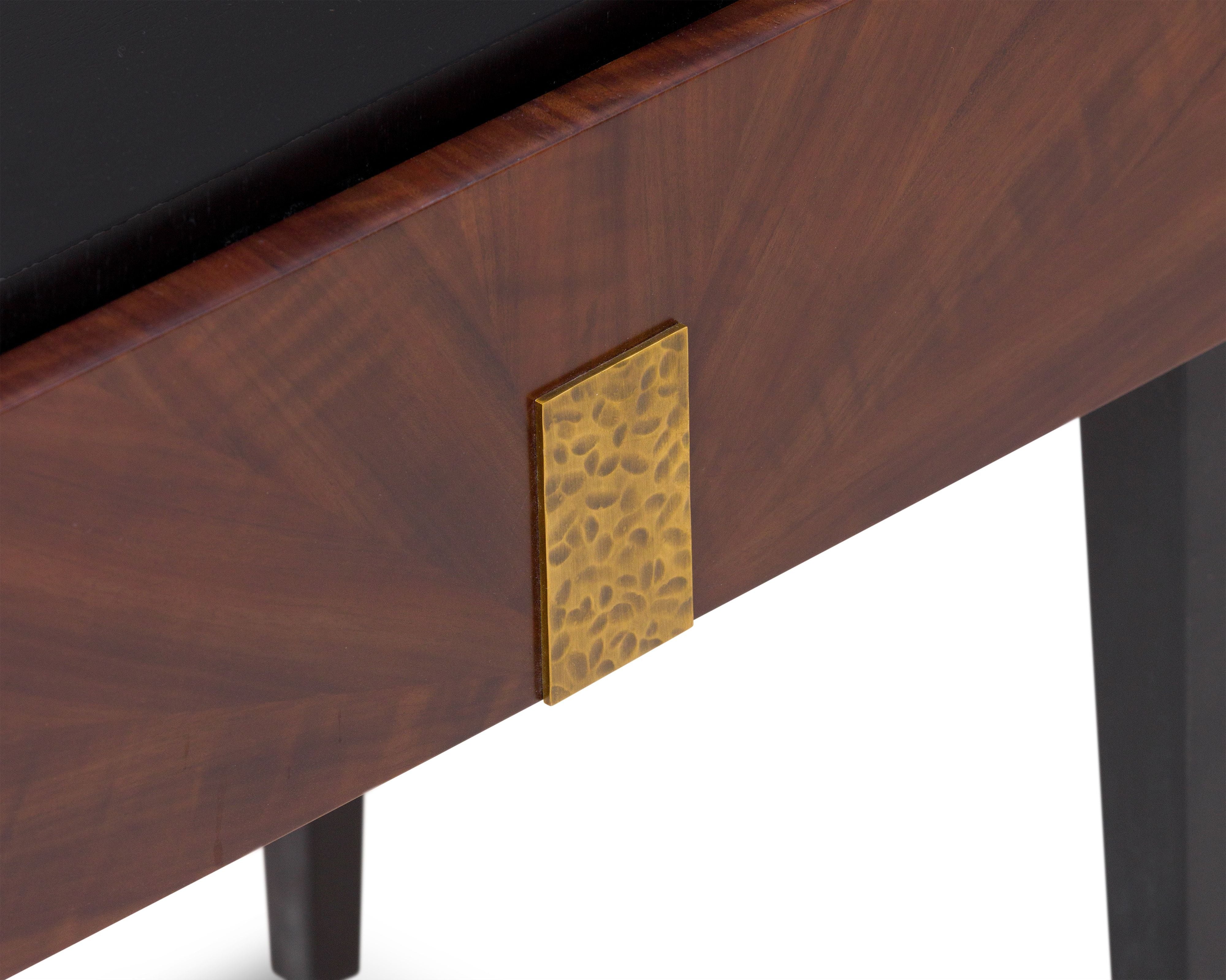 Its bold black satin veneer contrasts beautifully with the rich brown acacia wood, highlighting a striking natural grain that adds depth and character. Elevated on sleek, tapered legs, it seamlessly complements both modern and classic interiors. At its centre, a hammered brass handle introduces a unique, textured detail, enhancing its refined aesthetic.
