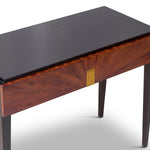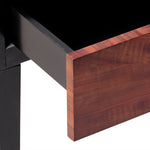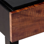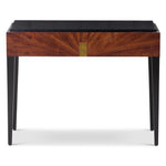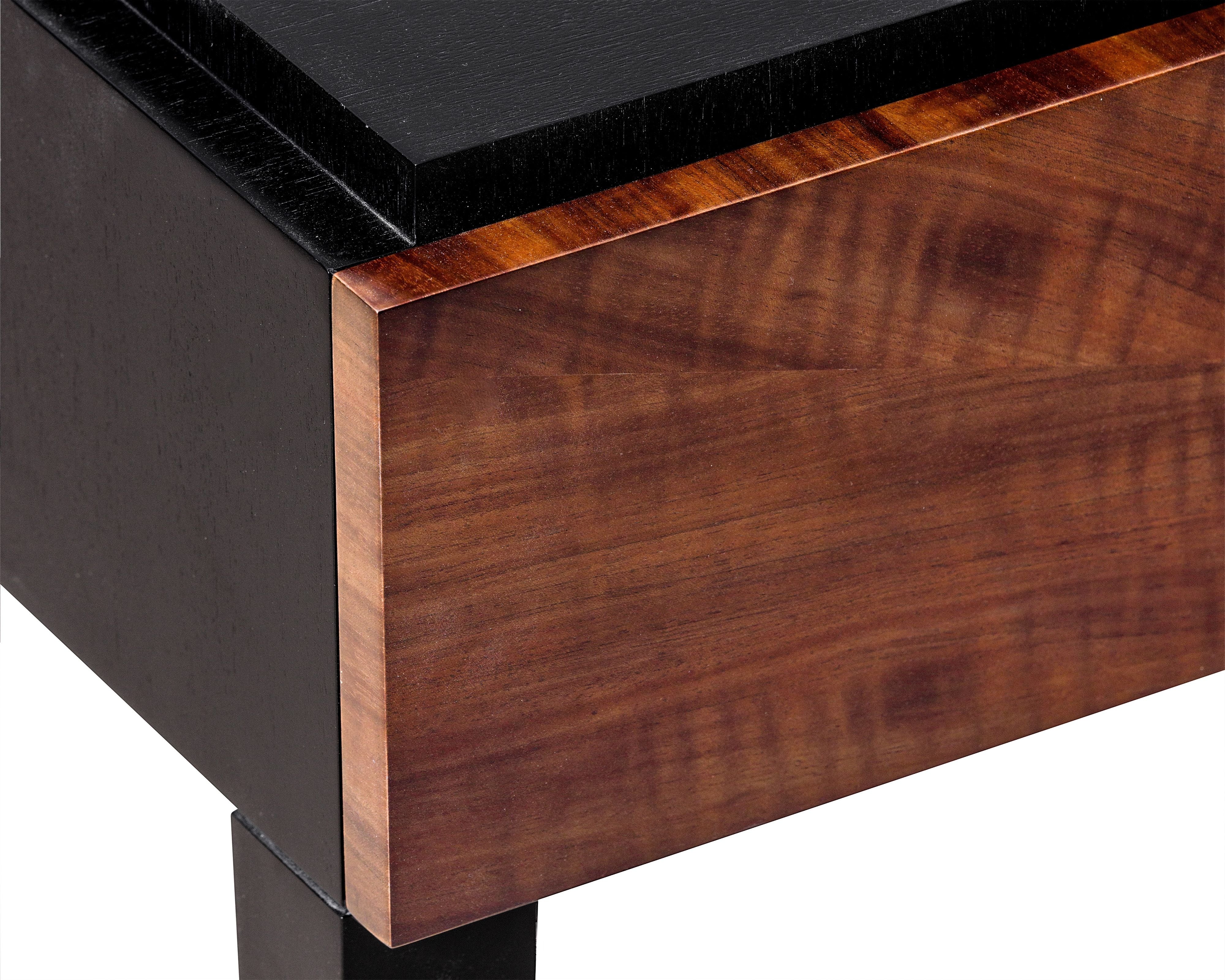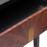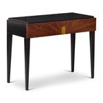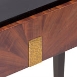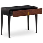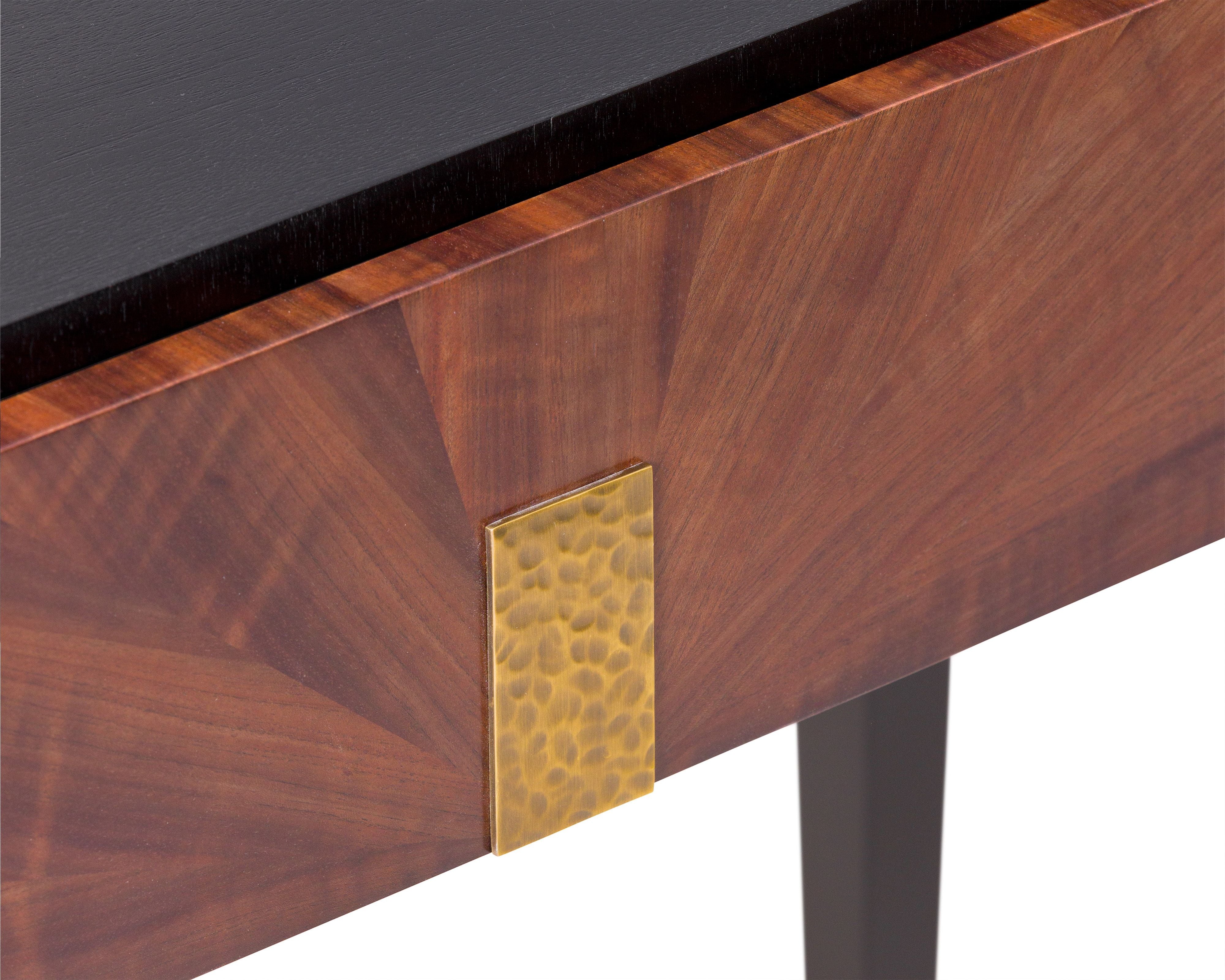 Crafted from acacia wood, its sleek, tapered legs and black satin veneer create a refined, contemporary aesthetic, while the warm brown drawer front showcases a unique wood grain pattern for a touch of natural beauty. A hammered brass handle adds a hint of vintage charm, completing the design with subtle contrast and texture.