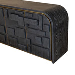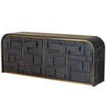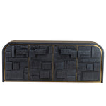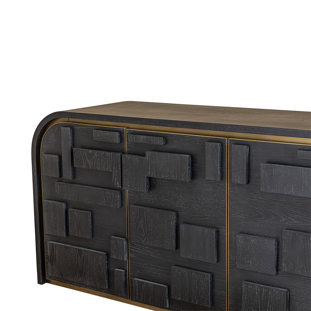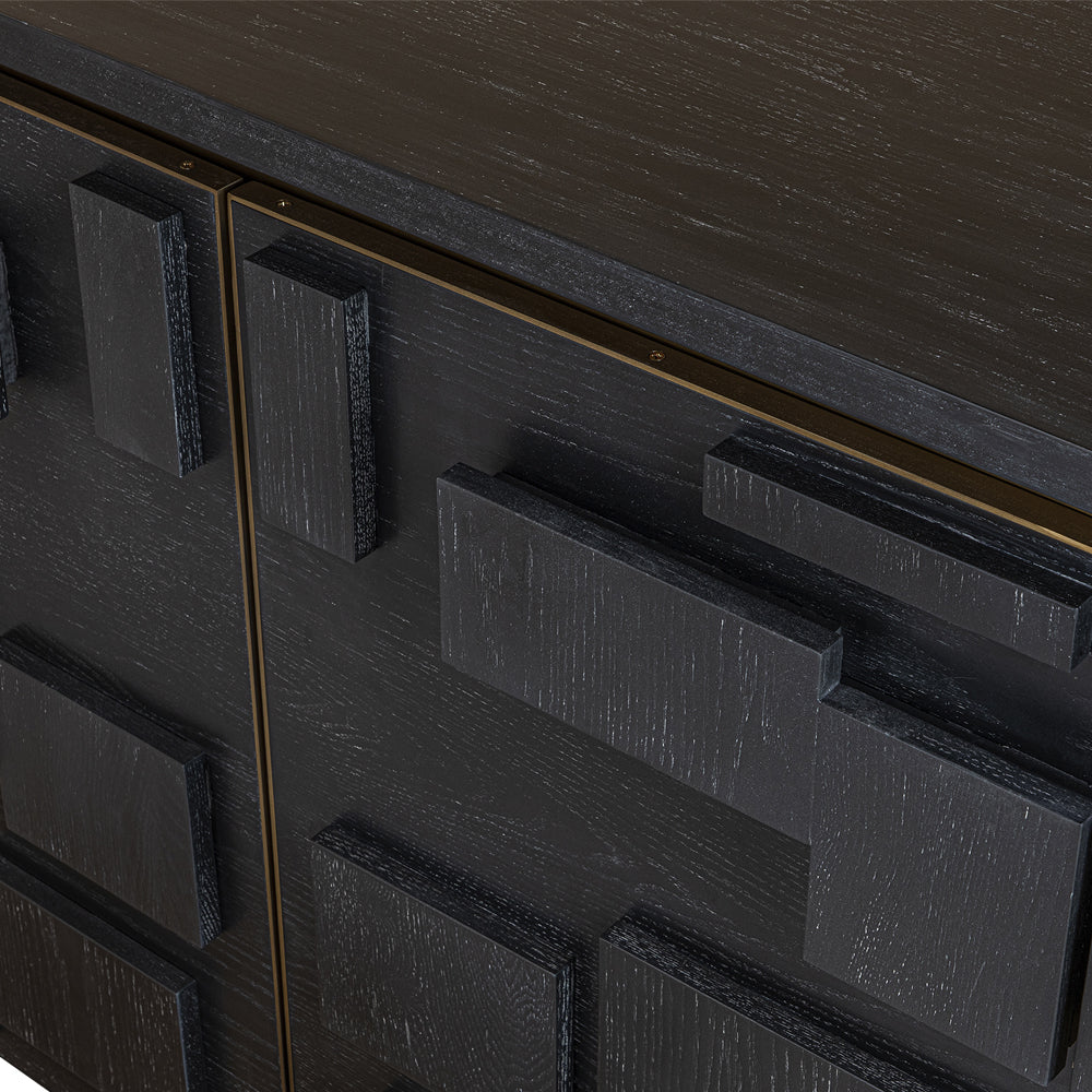 Consisting of sharp lines and gentle curves, this lovely cabinet is made from ebony cerused ash which allows its natural grain to shine through. It features four doors for adequate storage, each of which is detailed with an intricate, geometric pattern that juts out from the cabinet for a stunning 3D effect. A brushed brass trim elevates the piece with a subtle contrast.