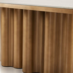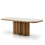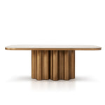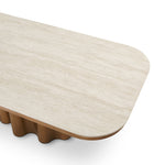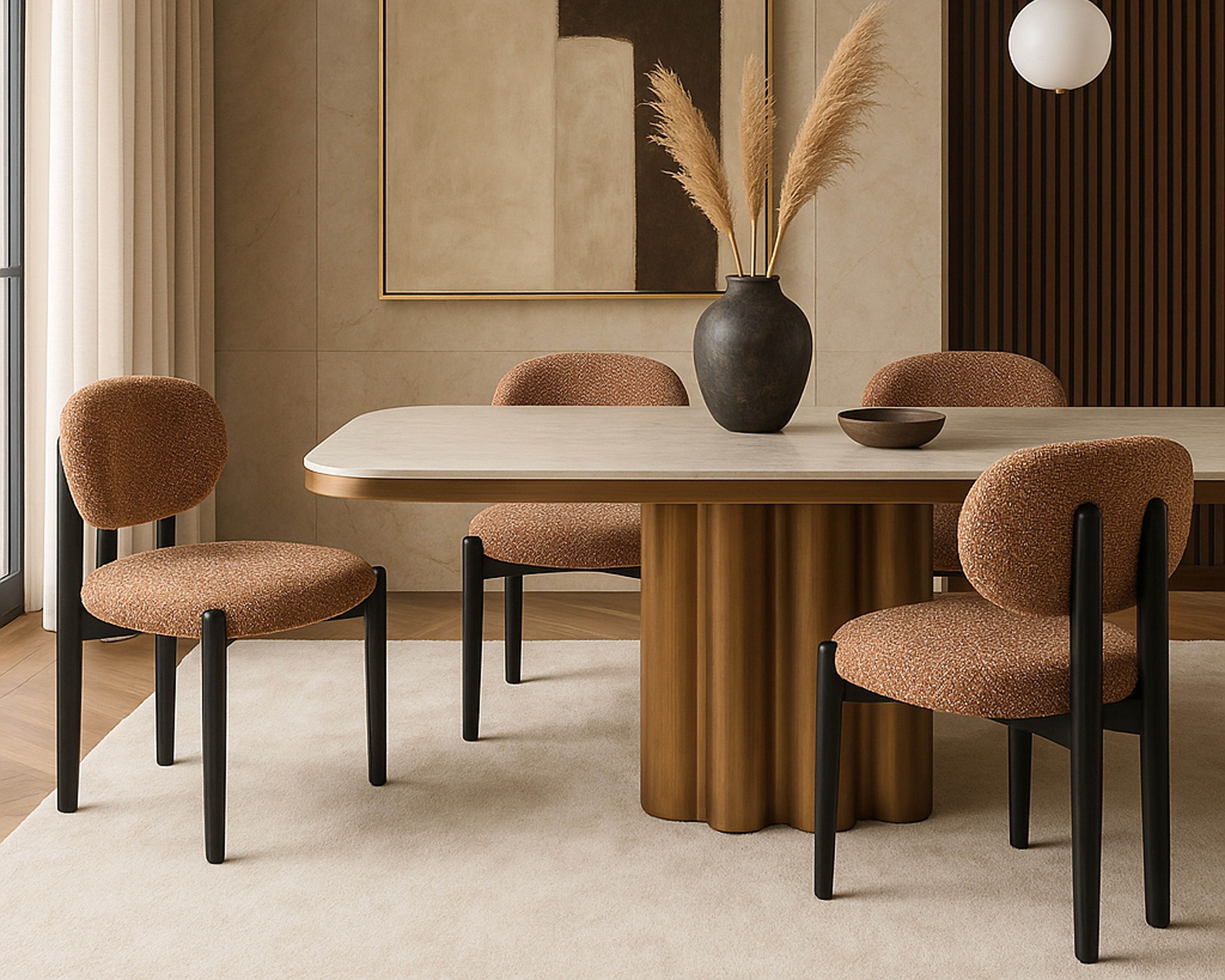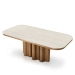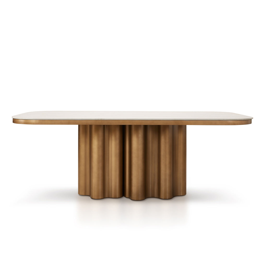 Its fluted steel base, finished in antique brass hairline, echoes classical design with a bold contemporary twist. The spacious top, crafted from ceramic with a luxurious travertine marble effect, combines the beauty of natural stone with the resilience of modern finishes. Softly rounded corners add to its timeless character, enhancing comfort and encouraging conversation.