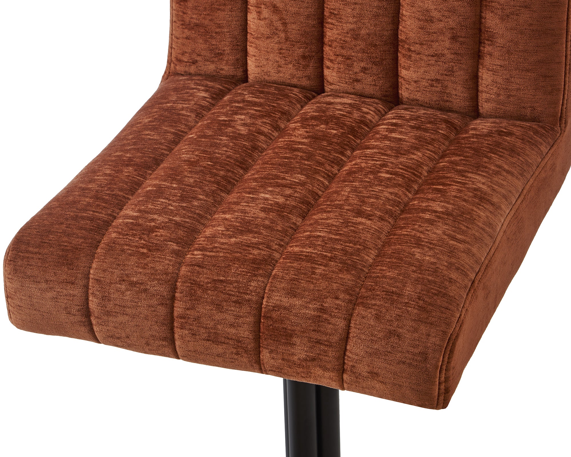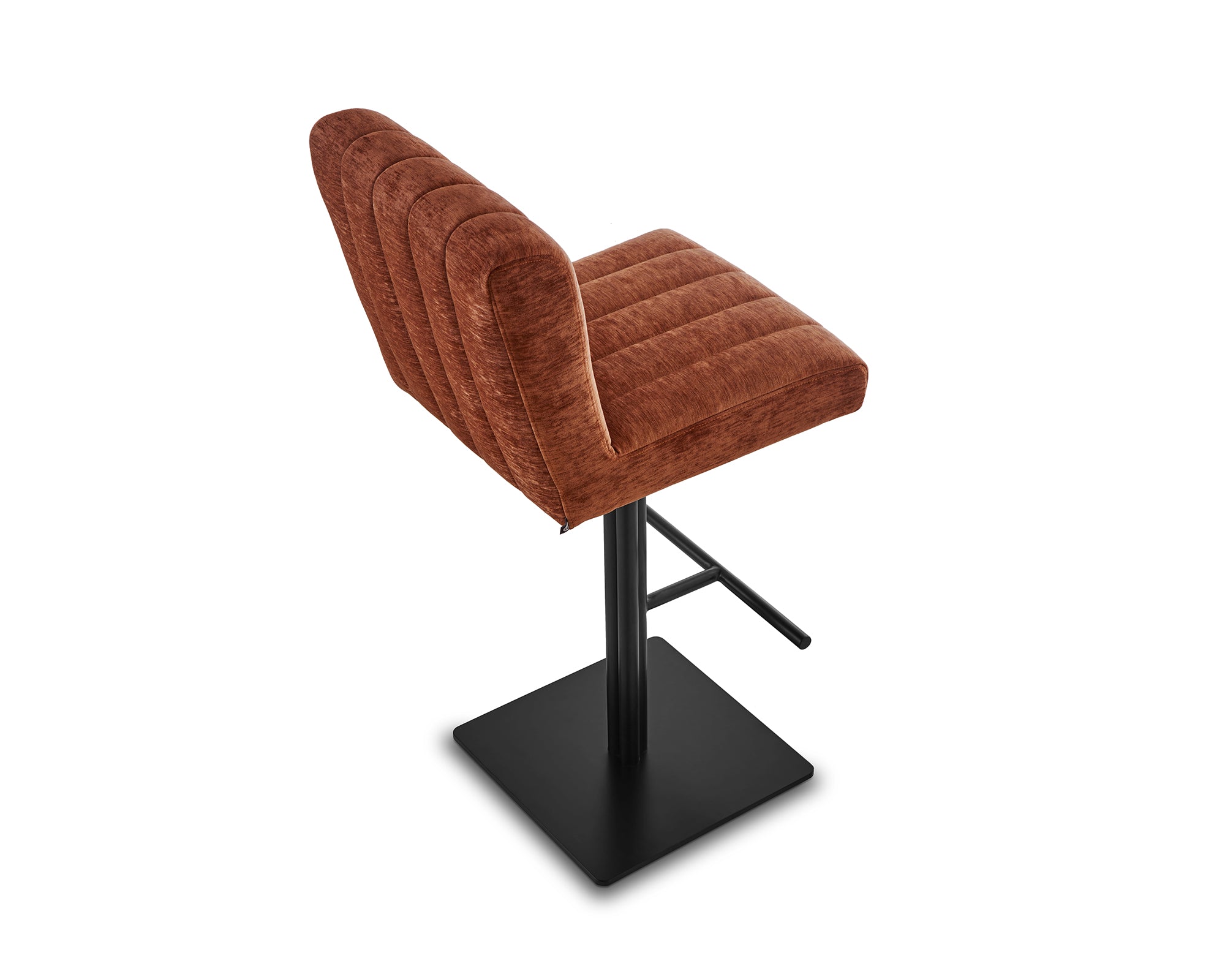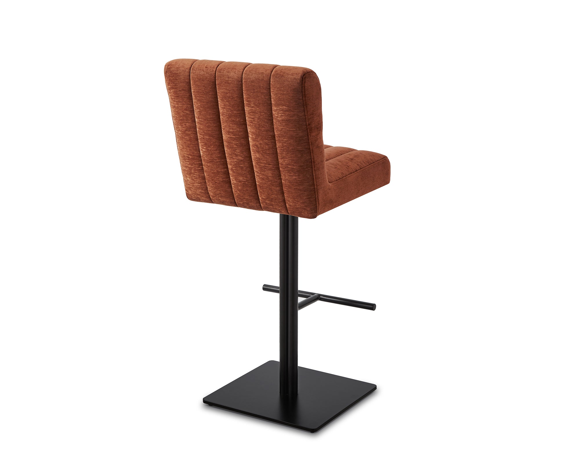Constructed from matt black steel, the stool emanates minimalist sophistication, courtesy of its sleek square base and towering support column. For enhanced comfort, a convenient footrest is seamlessly integrated into the design, and the seat itself is luxuriously upholstered in soft sysley rust fabric with deep stitching that creates a striking fluted effect.