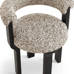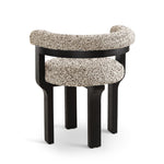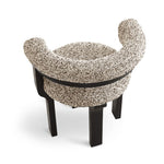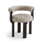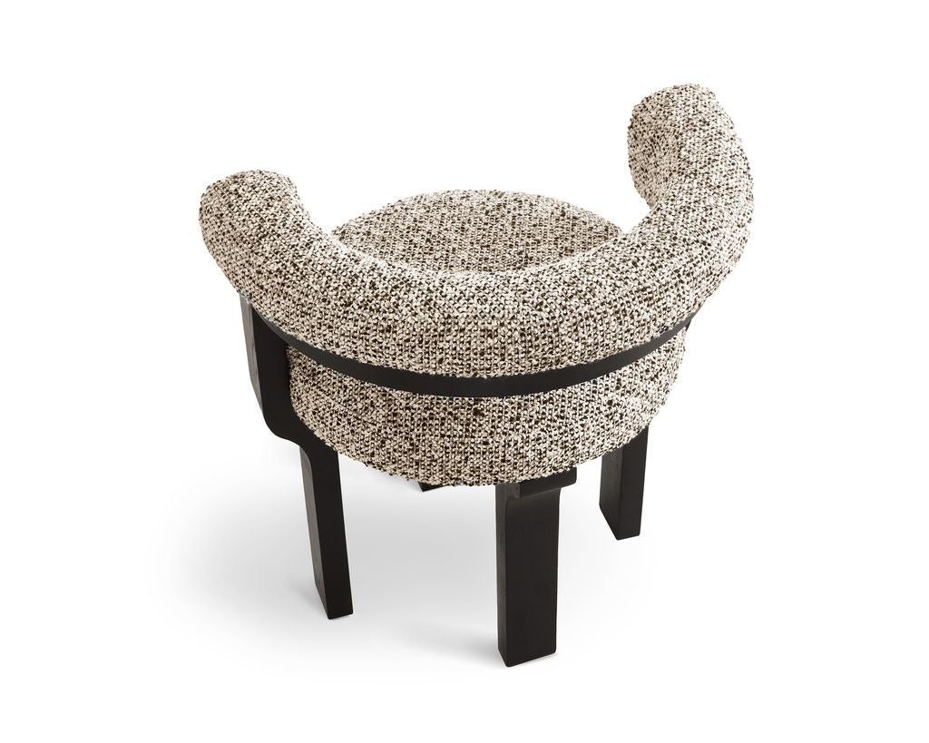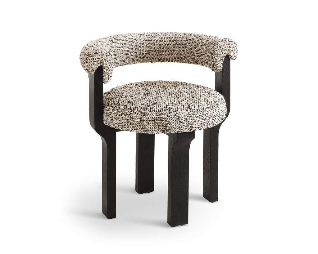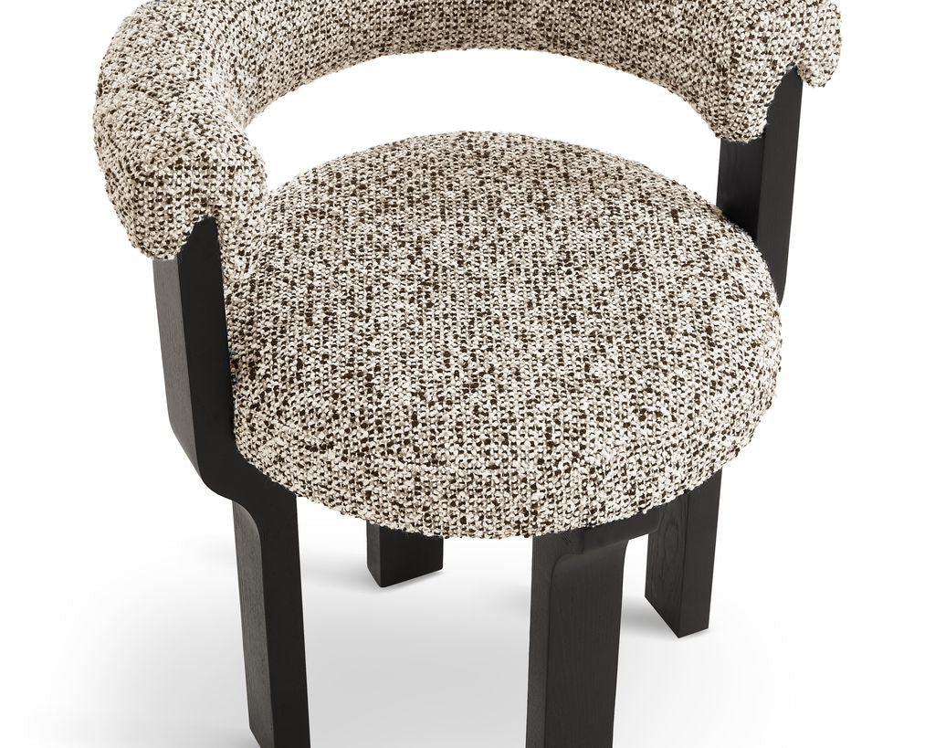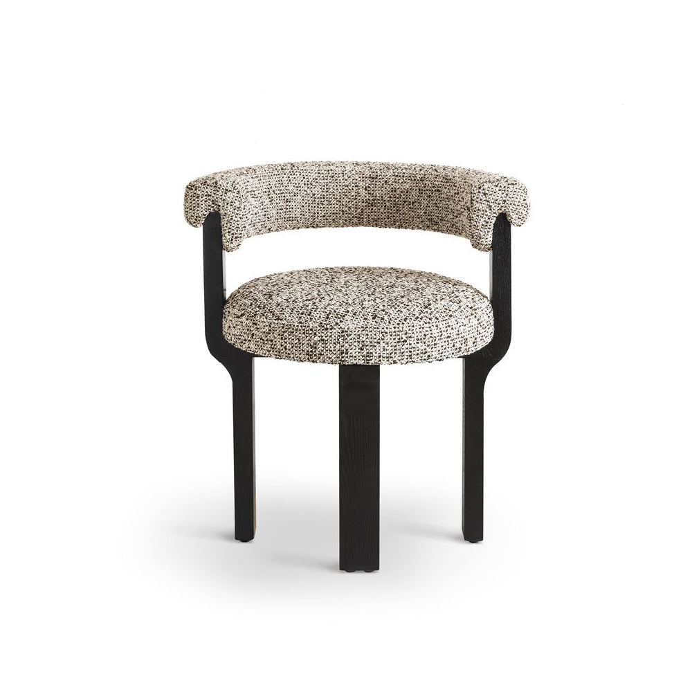 It rests on four sleek, subtly curved legs crafted from matte black ash wood, with two extending elegantly to support the backrest for added stability and visual interest. The plush seat ensures comfort, while the CRIB 5 Dexter Sparkle Stone upholstery introduces a warm, textural finish.