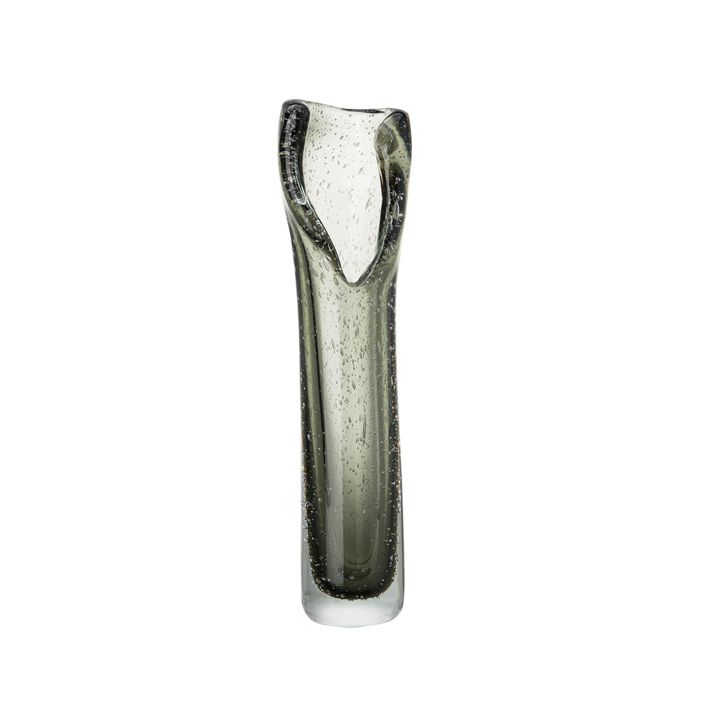 Grey glass has been carefully shaped by skilled artisans to create a piece that is both uniquely shaped and textured. From the distinct, low-cut lip of the piece to the small bubbles that give the impression of tiny water droplets, the Elise Vase is phenomenally detailed.