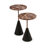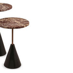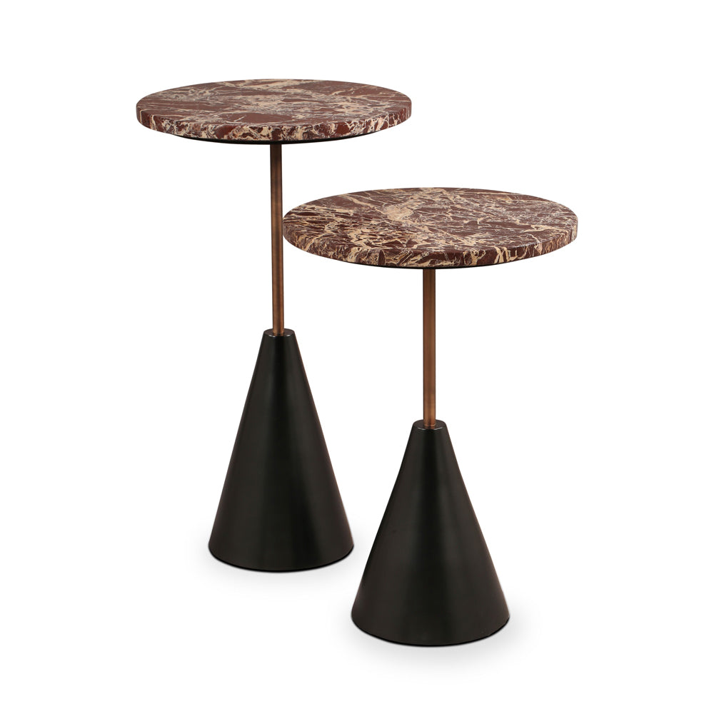 Each table pairs a luxurious Levante marble top with a conical black base and an antique bronze-finished stem, creating a rich interplay of textures and tones. Designed to work beautifully together or separately, the two sizes offer versatile styling options, whether for entertaining or everyday living.