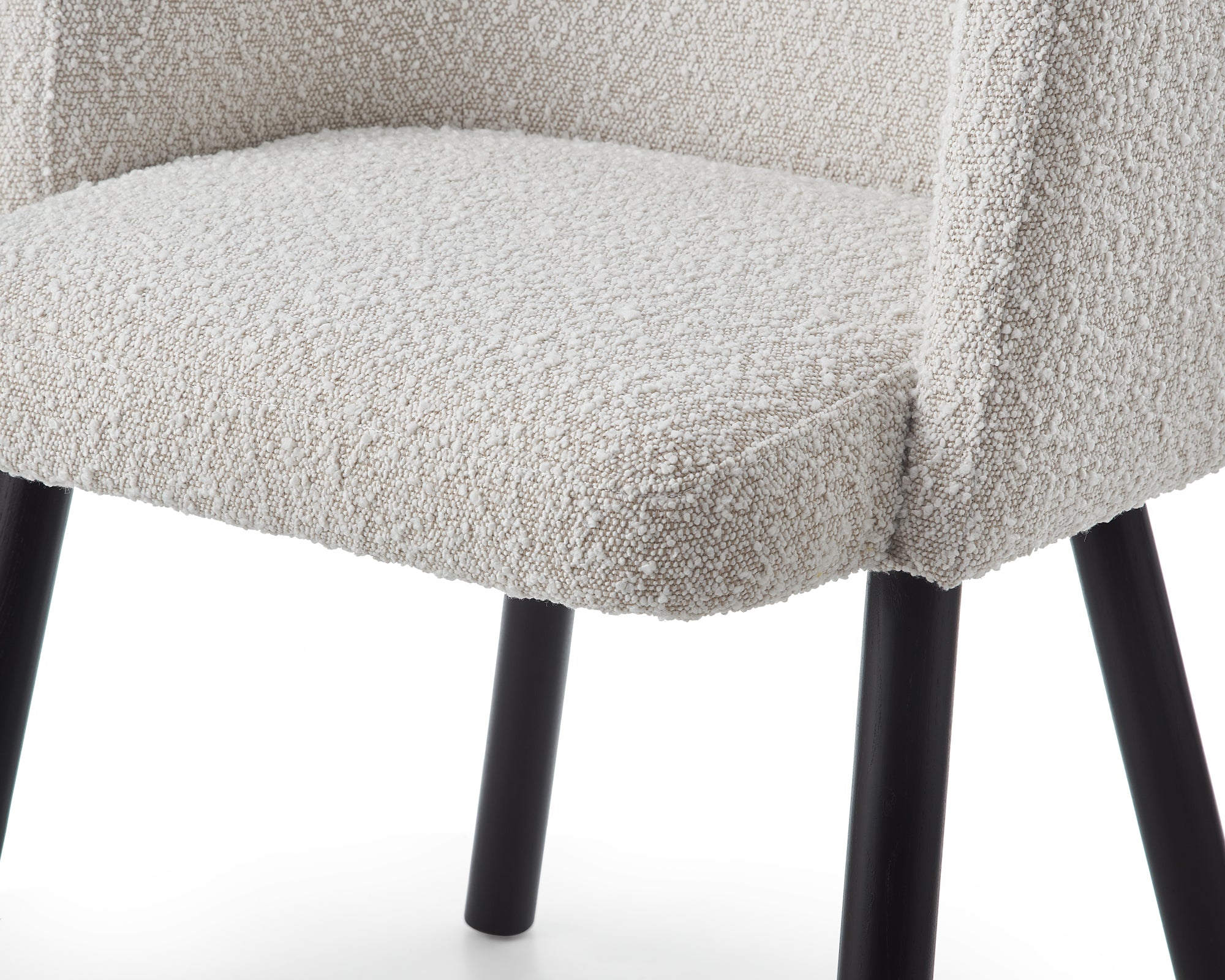 Exuding modern elegance from the very first glance, the Ethis Dining Chair will boost your dining experience to the next level. Accentuated by invitingly soft boucle upholstery, it features a padded seat and a curved backrest to frame your body so support and comfort are ensured. Four sleek solid ash legs complete the look, their matt black finish pairing with the sandy upholstery for a delicate contrast. With a laidback style and flawless comfort, the Ethis Dining Chair will bring a splash of sophistication to any space. Grouped around an equally stylish dining table it is easy to see their appeal.