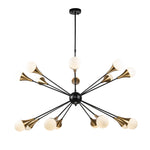 Emanating from a central matt black orb, sixteen sleek arms stretch outward, culminating in pristine white glass shades, each adorned with lavish antique brass fittings. This luminous constellation doesn't just light up a room; it transforms it.
