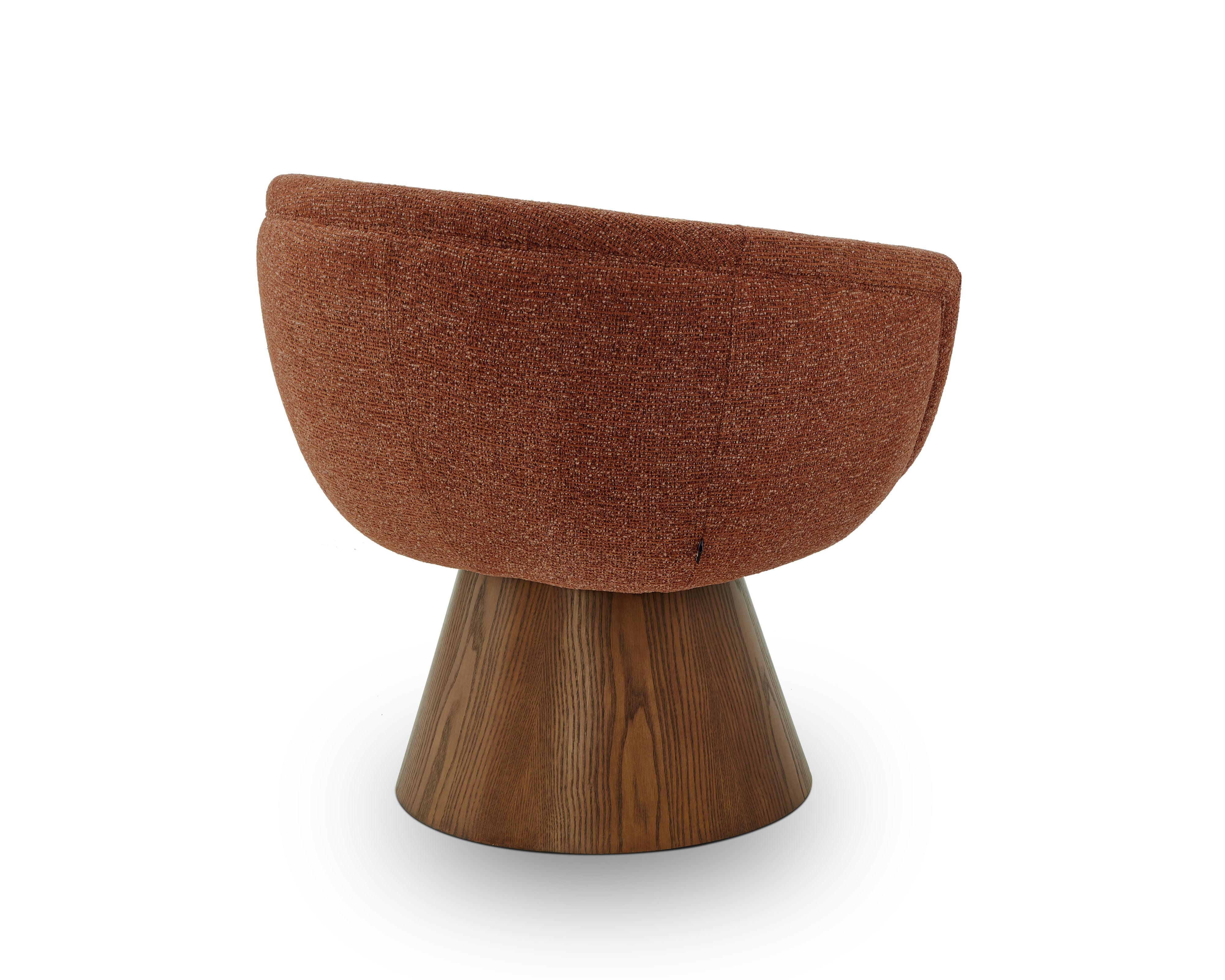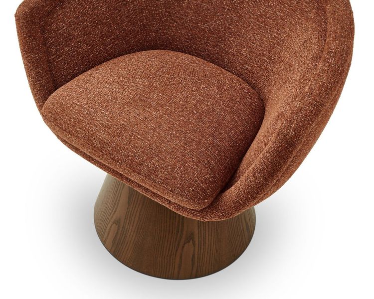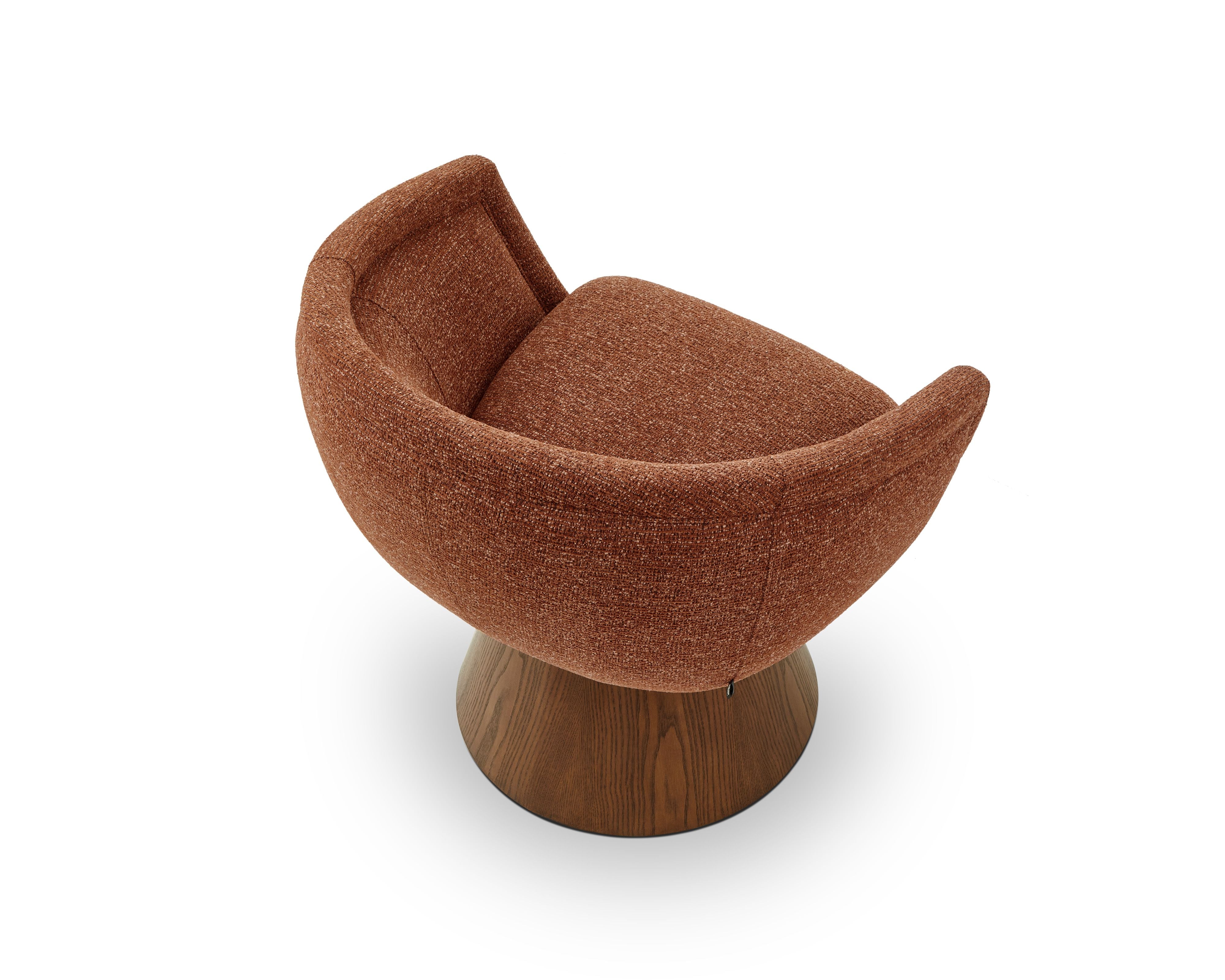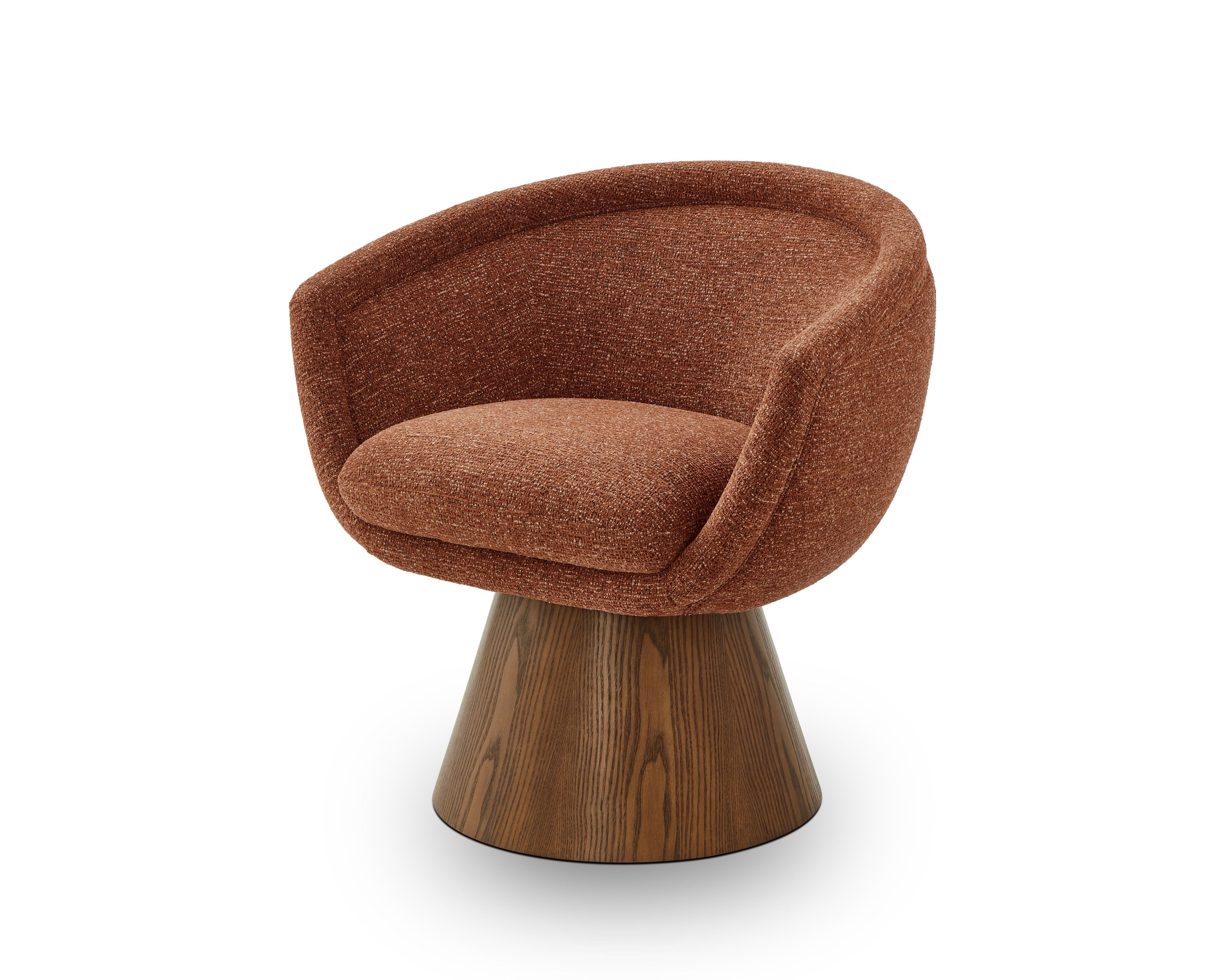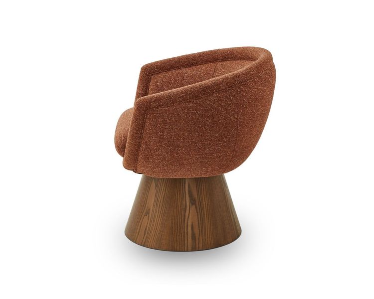 Crafted with a conical ash veneer base in a warm brown finish, it features a plush seat and a rounded, cocoon-like backrest for a cosy, supportive sitting experience. The soft recycled upholstery in a beautiful chestnut red hue adds a tactile element, enhancing its appeal.