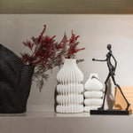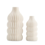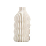 This white ceramic vase captivates with its organically fluted design, echoing the precision and grace of hand-folded origami. Its crisp edges and textured aesthetic create a dramatic presence, making it a statement piece on any shelf or console. When paired with vibrant flowers, it transforms into a bold, contrasting visual spectacle.