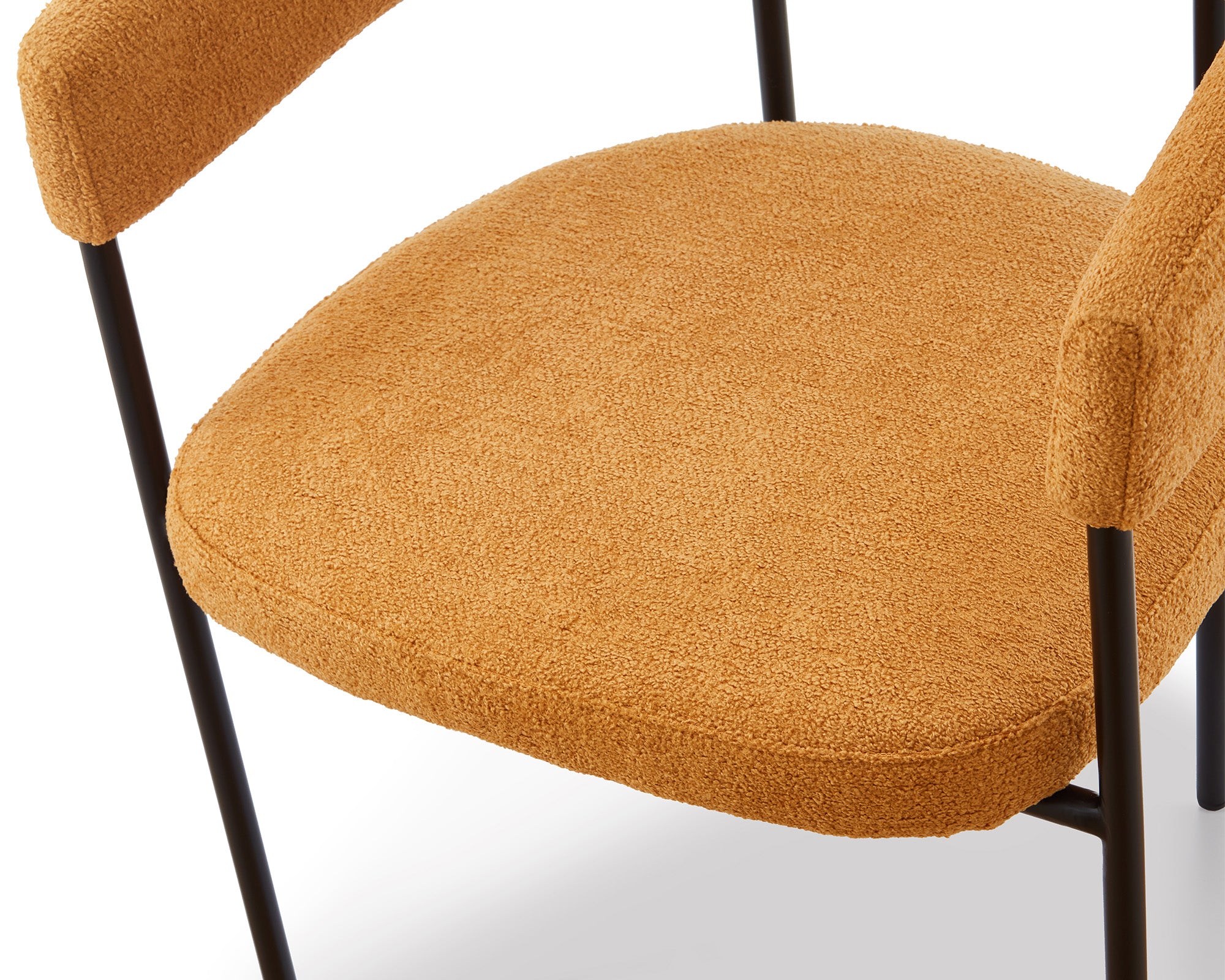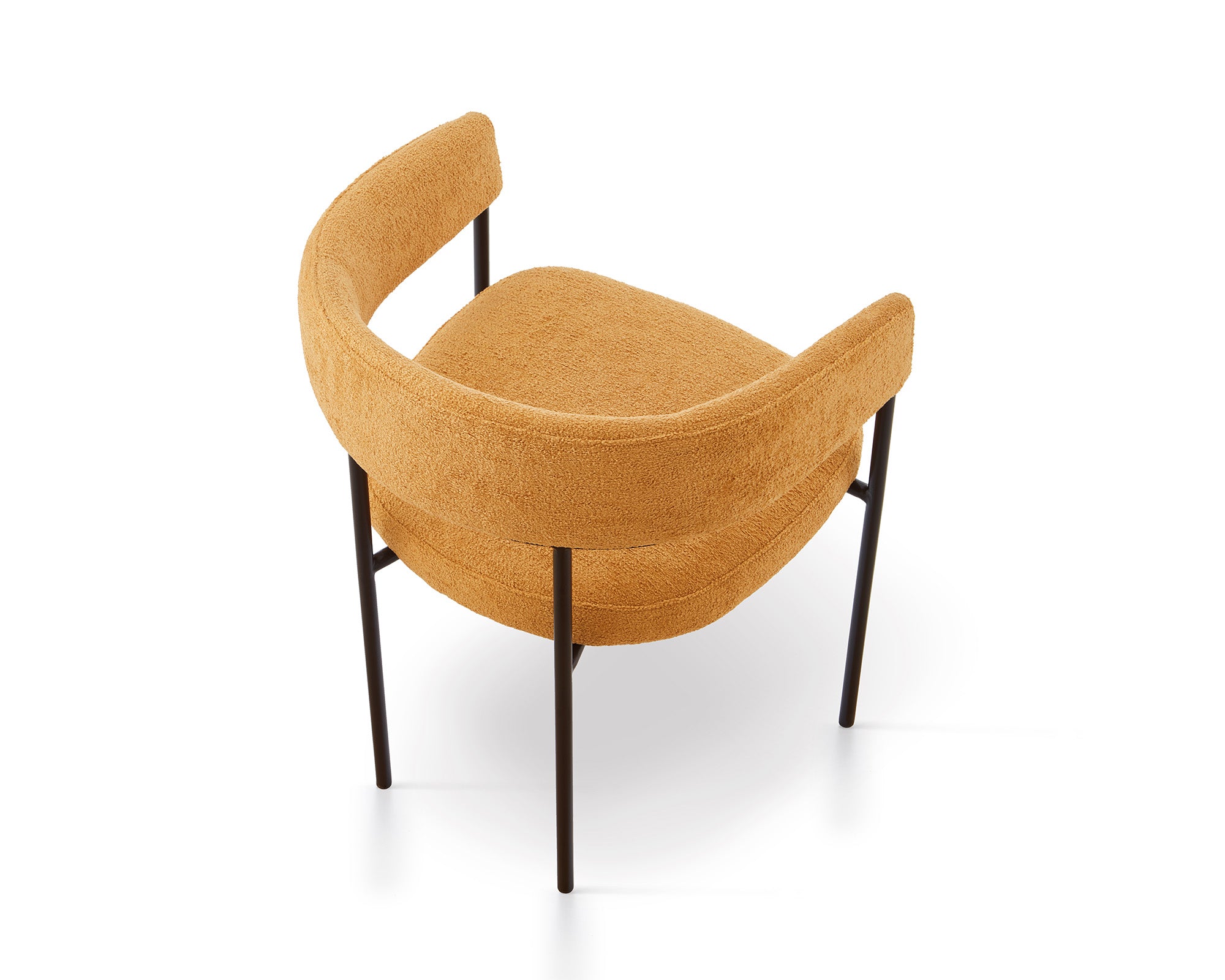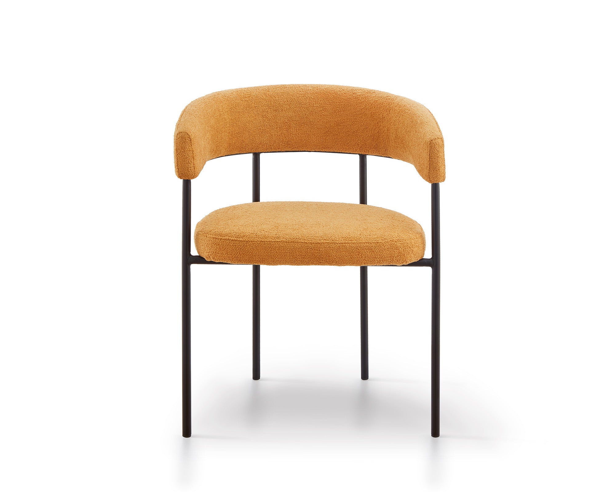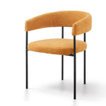 Supported by sleek matt black steel legs, the chair features a plush seat and gracefully curved backrest, both of which are upholstered in the inviting Lander Ochre Linen. The rich yellow hue serves as a stunning contrast to the black metalwork, culminating in an undeniably sophisticated look.