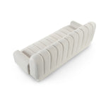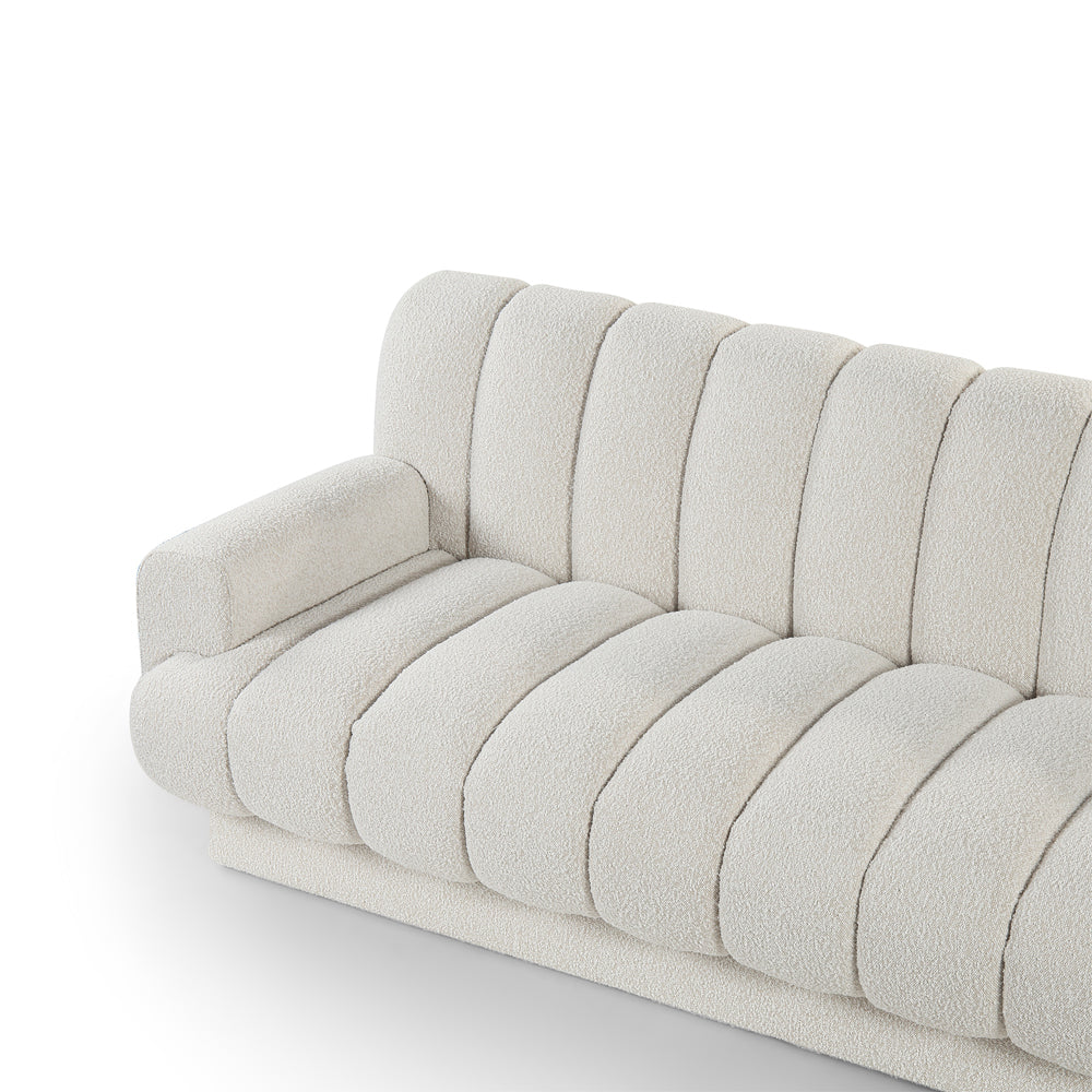 With sharp lines and smooth, curved angles, the Keiron Sofa boasts a sophisticated silhouette guaranteed to bring depth and intensity to the centre of your space. Plush and comfortable, it is upholstered in a warm, sandy boucle with deep stitching for stylish channel tufting that draws the eye. Why not pair it with a vibrant throw or a pair of scatter cushions for a bold splash of colour?