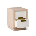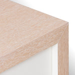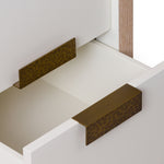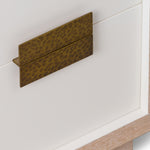 Its oak wood frame is sleek and stylish, its natural finish highlighting its subtle grain. The two white lacquered drawer fronts offer a striking contrast, bringing a fresh, modern touch to your space. Completing the design, hammered antique brass handles add a hint of vintage charm while ensuring effortless functionality.