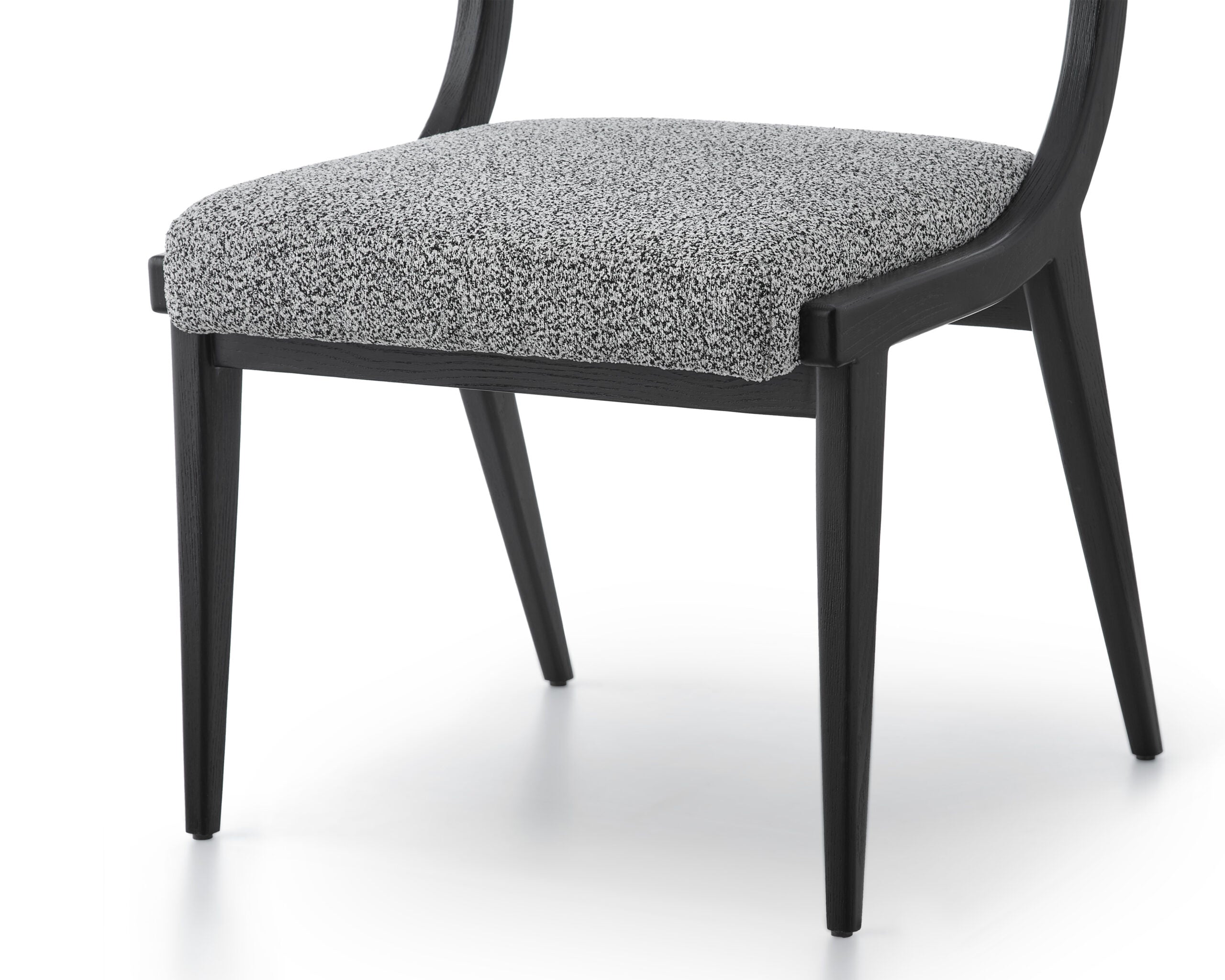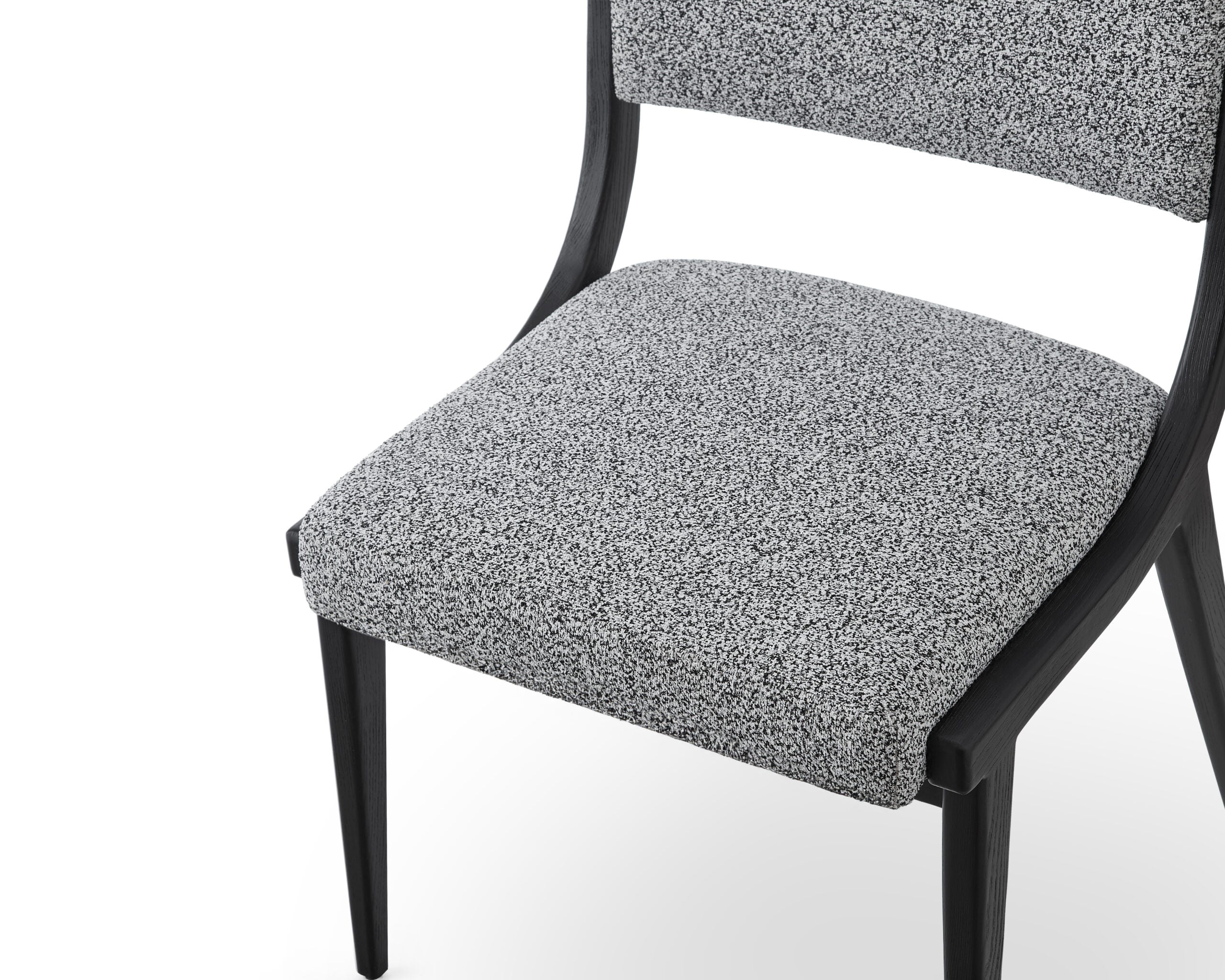 With sleek lines and smooth curves, its four tapered legs, crafted from solid wood and finished in a sophisticated matt black, not only ensure durability but also lend a dash of contemporary charm. Upholstered in a luxurious Speckle Grey fabric, the plush seat and backrest invite you to indulge in unrivalled comfort and relaxation. When paired around a dining table, these chairs create a harmonious aesthetic that effortlessly enhances your dining experience.