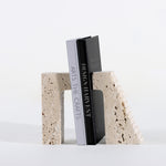 Carved from stone beige travertine, one bookend echoes the theatre's iconic steps, while the other exudes smooth sophistication, creating an enchanting contrast. These bookends not only organise your literary collections but also introduce a compelling visual dynamic to your shelves or bookcase.