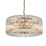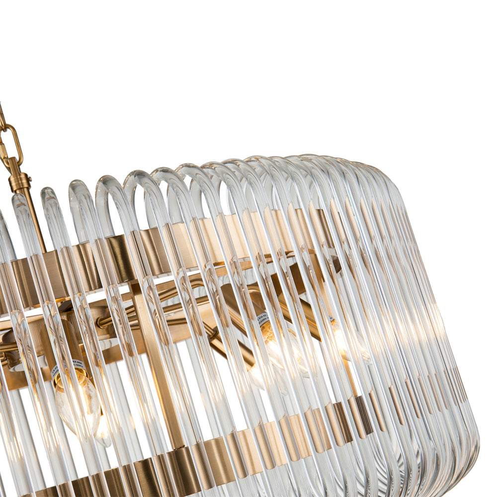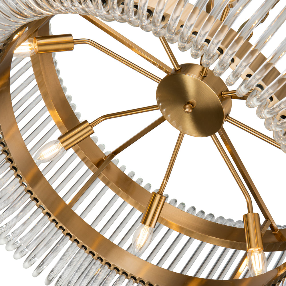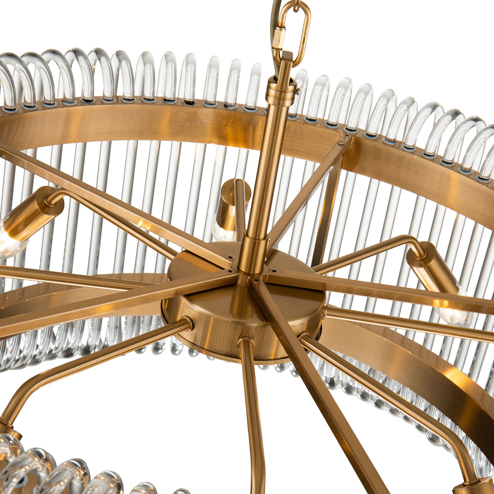 Its charm begins with the immensely classy, spoked frame with its brushed brass finish, and extends to delicate loops of clear glass. The result is one of pure elegance as this lamp hangs above your space and fills it with radiant light.