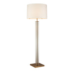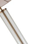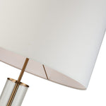 Showcasing a cylindrical clear glass column, this lamp is anchored by a sleek antique brass base, while its white fabric shade diffuses a soft, warm glow. The elegant transparency and refined monochrome palette make it an ideal addition to contemporary, minimalist or classic interiors.