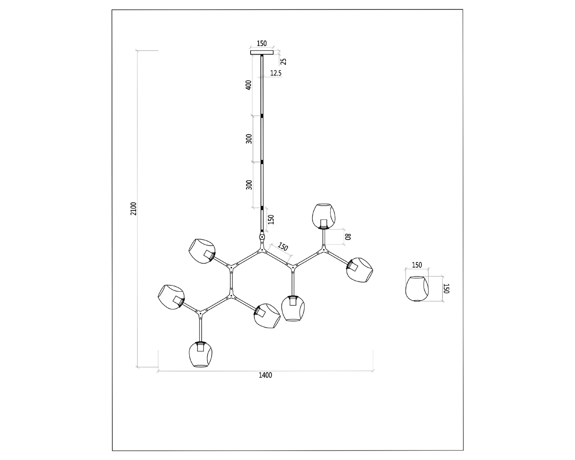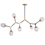 This is a fitting with bespoke depth and texture across the whole piece. There are seven lights individually branching off to suggest a modular style. The frame is bronze and black for a lovely elegance. Each light is surrounded by glass shades that are hand-blown for a unique quality.