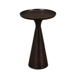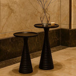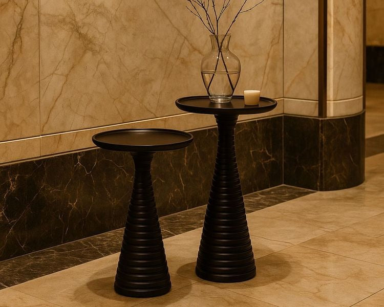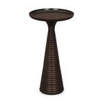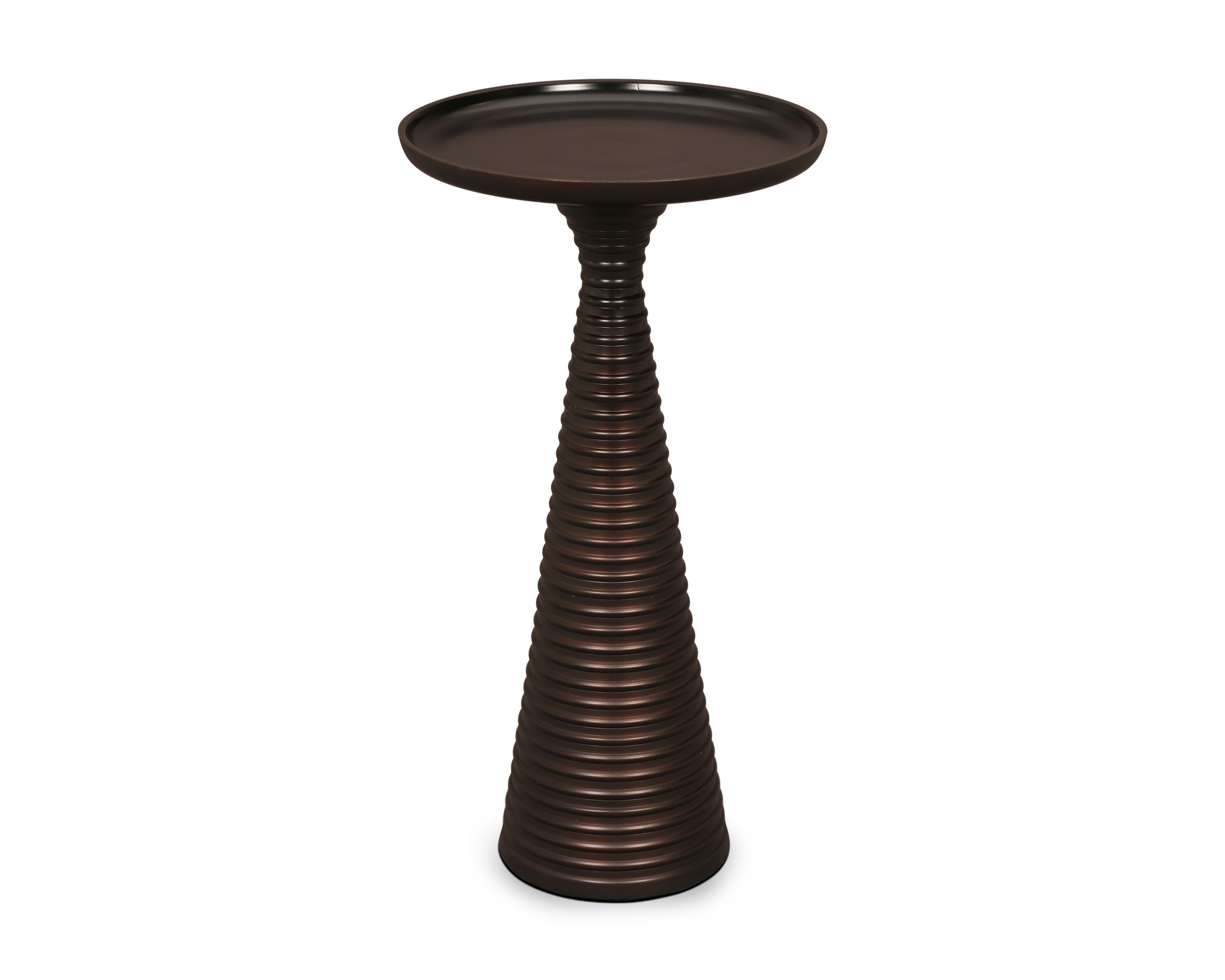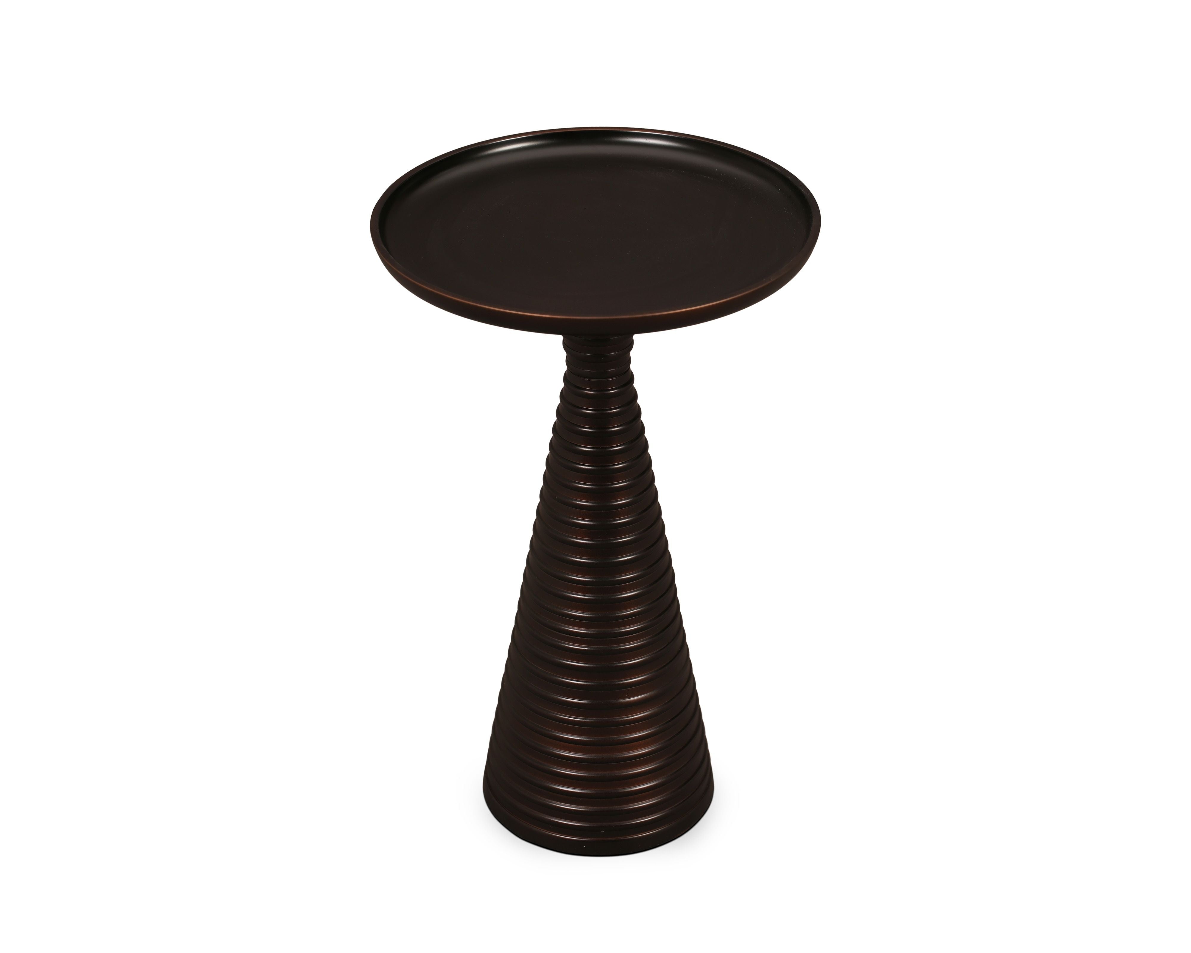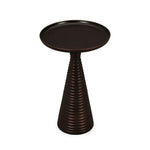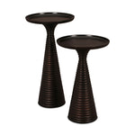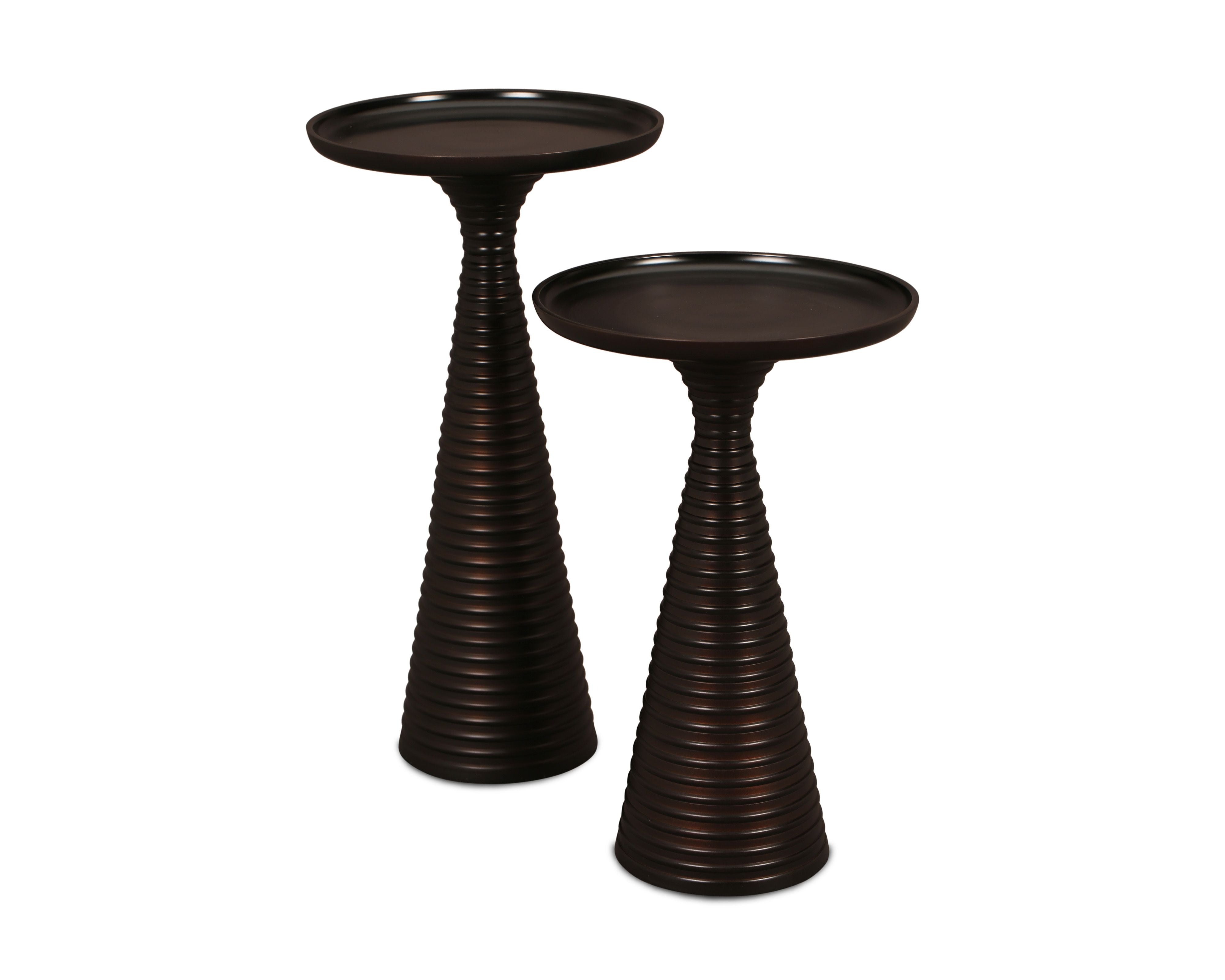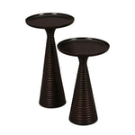 Each conical metal base features a bold ridged design, bringing a stylish brutalist edge enhanced by a rich dark bronze painted finish. The smooth, tray-like tops introduce a touch of functional minimalism, making it perfect for drinks, remotes, or decorative pieces. Use them together for a layered, cohesive look, or place them individually throughout your space.