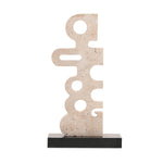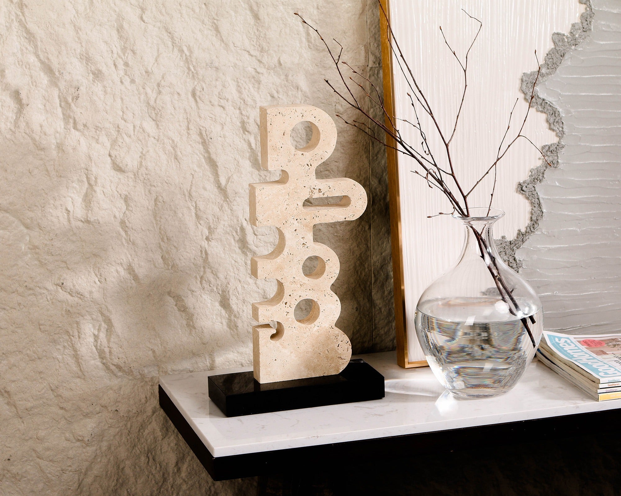 Crafted from beige travertine, its raw, tactile finish enhances its bold vertical silhouette, featuring geometric cut-outs that create a captivating visual impact. Resting on a sleek black marble base, it offers both stability and a dynamic contrast, balancing minimalism with artistic expression.