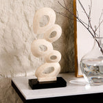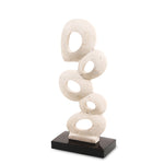 Crafted from beige travertine, its organic, interconnected shapes create a sense of movement and balance, making it a captivating focal point. Resting on a sleek black base, it offers a beautiful contrast of natural texture and refined sophistication.