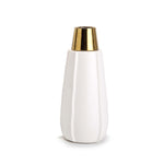 Inspired by clean and simplistic interior design, this exquisite vase showcases a sleek form crafted from white ceramic with delicate linear details. Its understated elegance is further enhanced by a gleaming golden trim that gracefully accentuates the top. It serves as a perfect canvas for your floral arrangements, allowing you to create captivating displays.